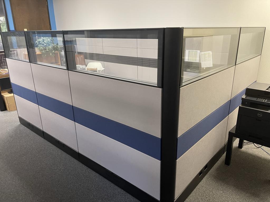 Description We have 10 Stations recently traded in of very nice Glass Herman Miller Ethospace that is 62" tall and has wing panel drop downs as well. Each station has a grey fabric with a blue striped center tile outer rim. These cubicles are very classy and elegant, perfect for any office space.