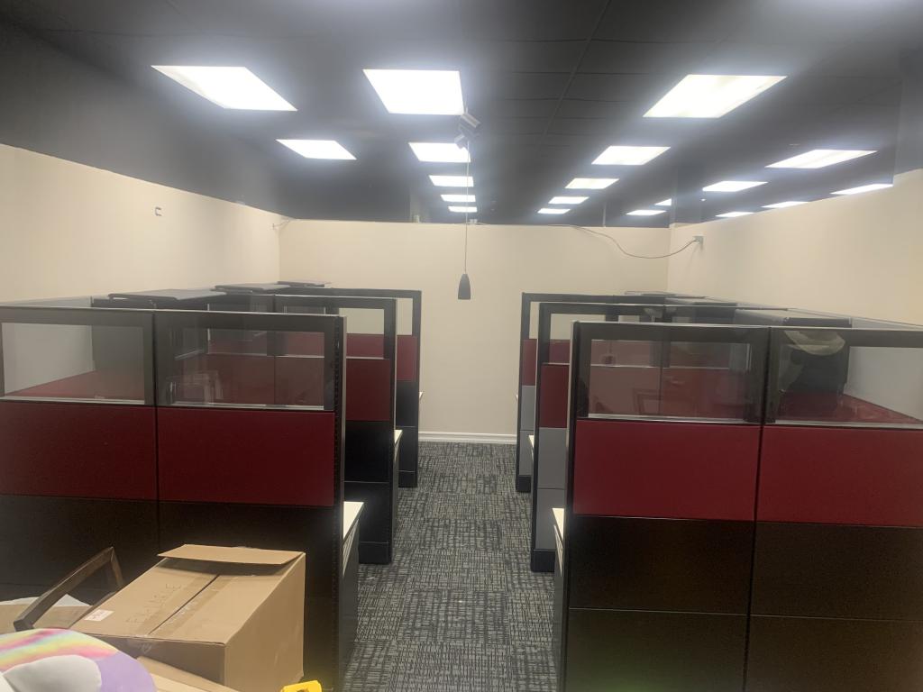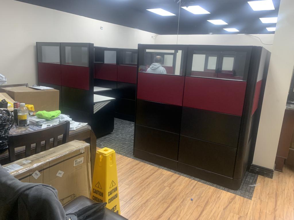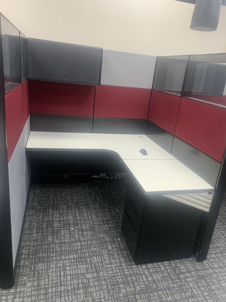 Description We have Herman Miller Ethospace cubicles in stock. These cubicles have a dark red beltline, top glass, dark tone black trim. Each cubicle comes with one pedestal. Overhead units are additional based on size, style and quantity.