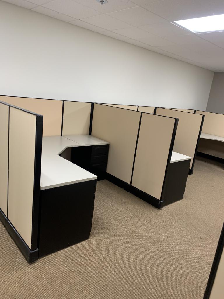 Description We have these very clean newly refurbished Herman Miller A02 cubicles. They are 6'x6'x53" tall and come in a neutral beige fabric color with dark tone trim and inner tone worksurfaces.