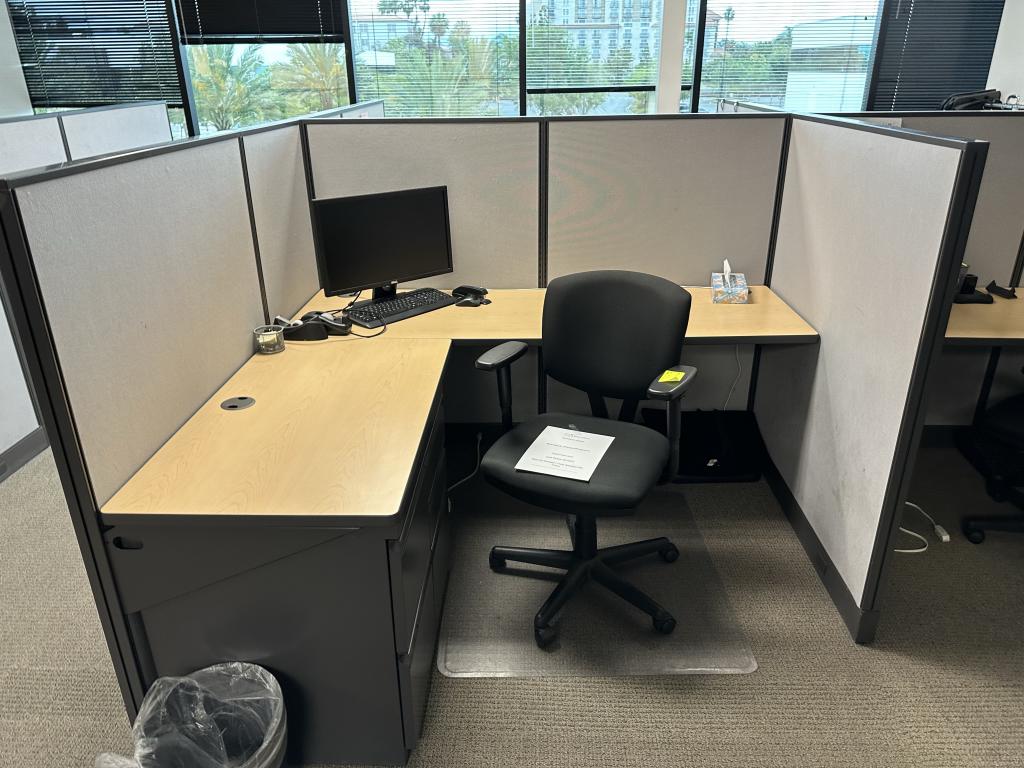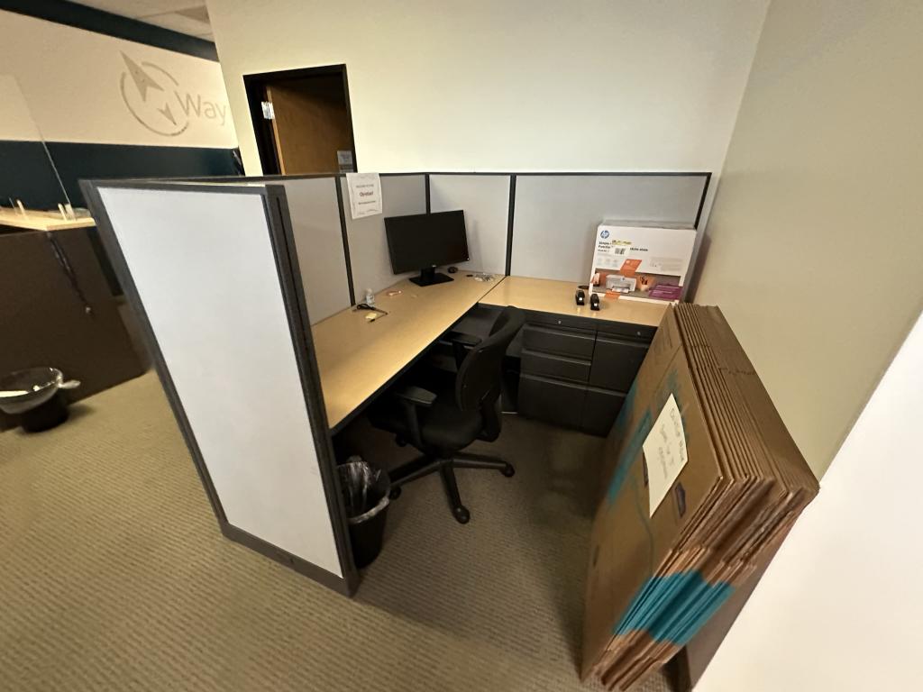 Description We have these Hon cubicles that are 6'x6'x53"T with maple surfaces. Each cubicle comes with power on the spine and everything pictured. Each station comes with a BBF and FF pedestal included.