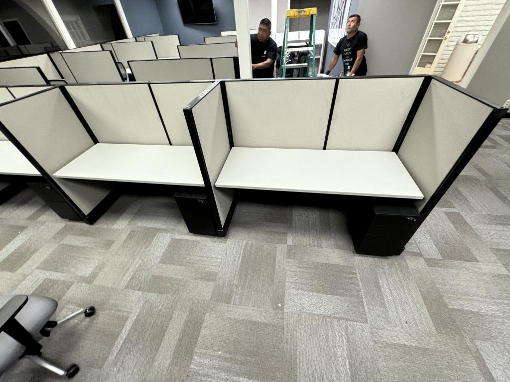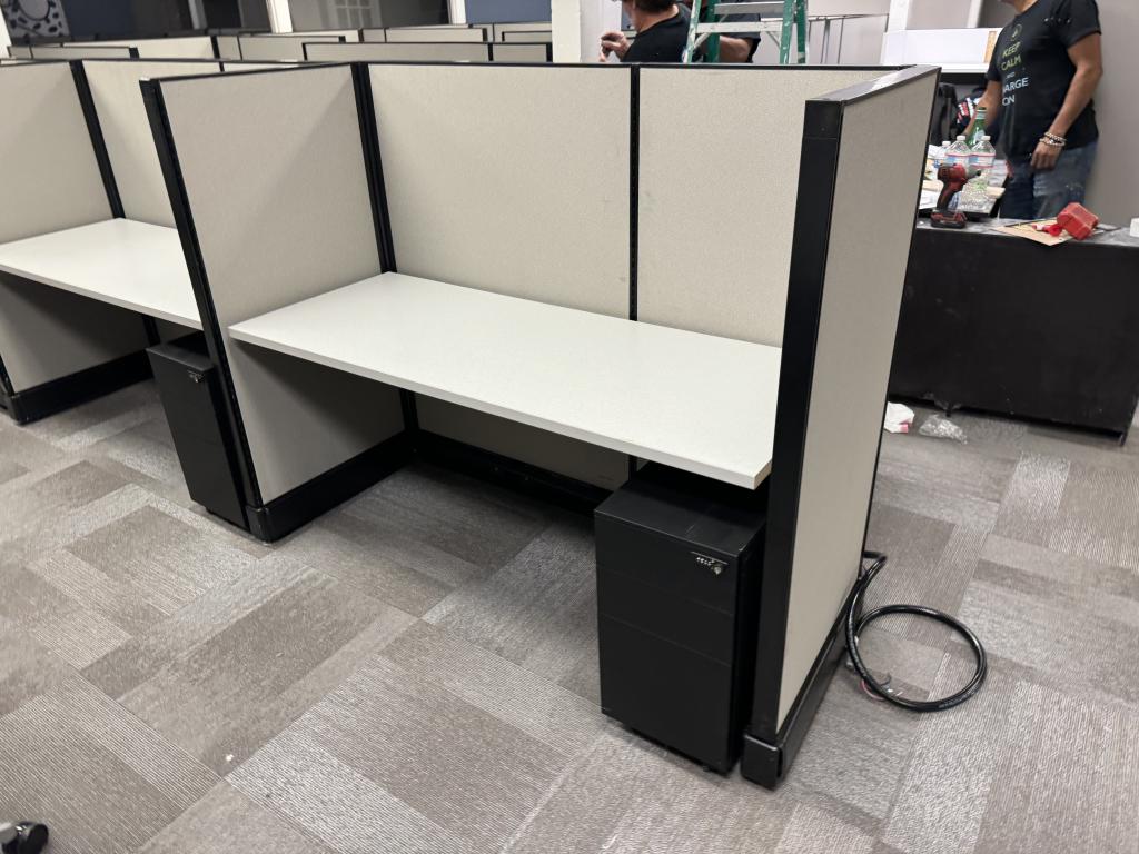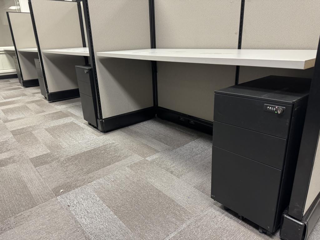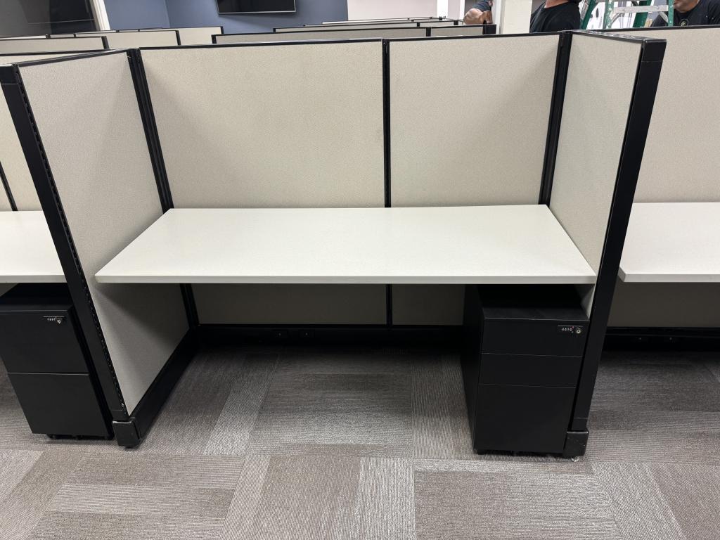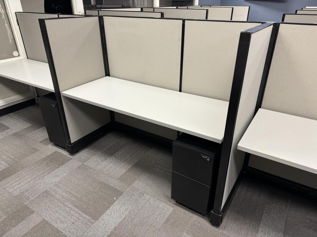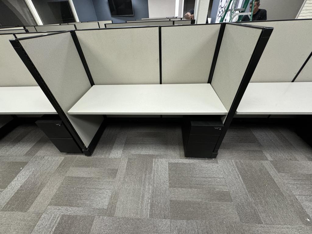Description We have these Herman Miller A02 stations that are 5’x2’x53”. Each station is powered down the spine and comes with a mobile box box file pedestal. The stations come with a neutral fabric and a dark tone trim.