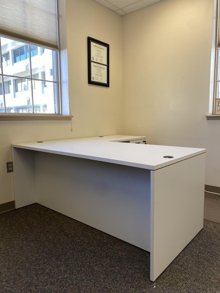 Description We have this white 6’x6’ double pedestal desk that is brand new in excellent condition. Each pedestal is new and comes with locking keys.