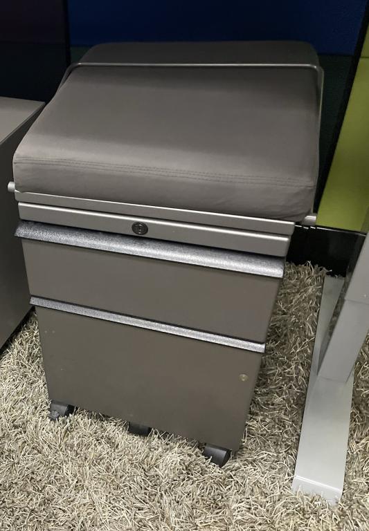 We have these Knoll gunmetal grey with black cushion pedestals that come with a box file combination, handle and casters. This pedestal is perfect for any desk solution as an extra storage component.