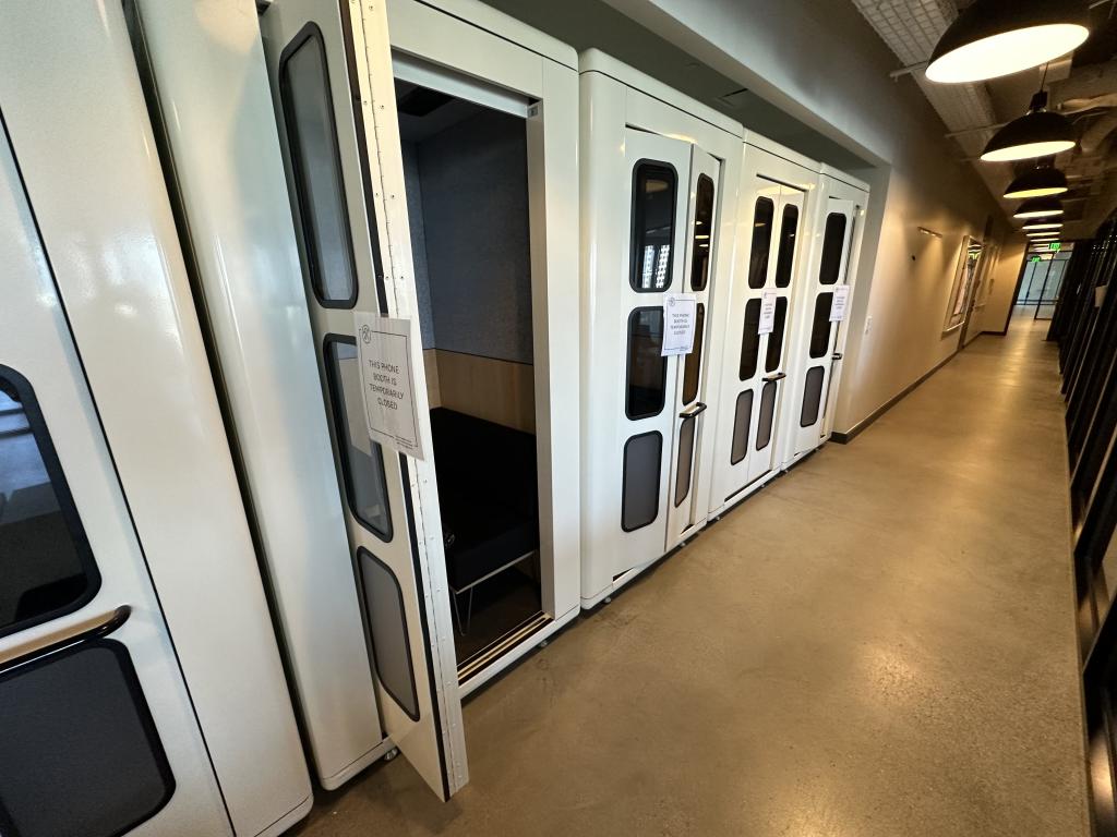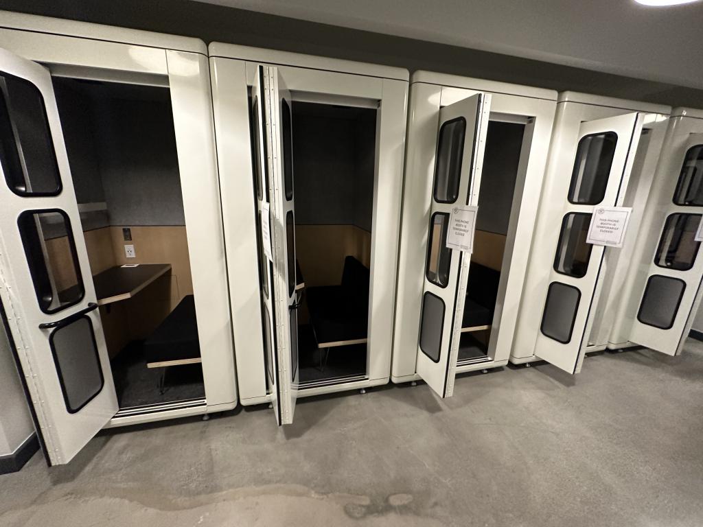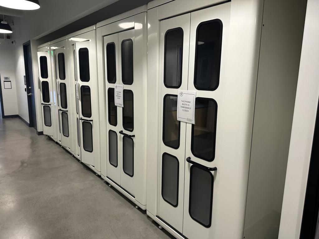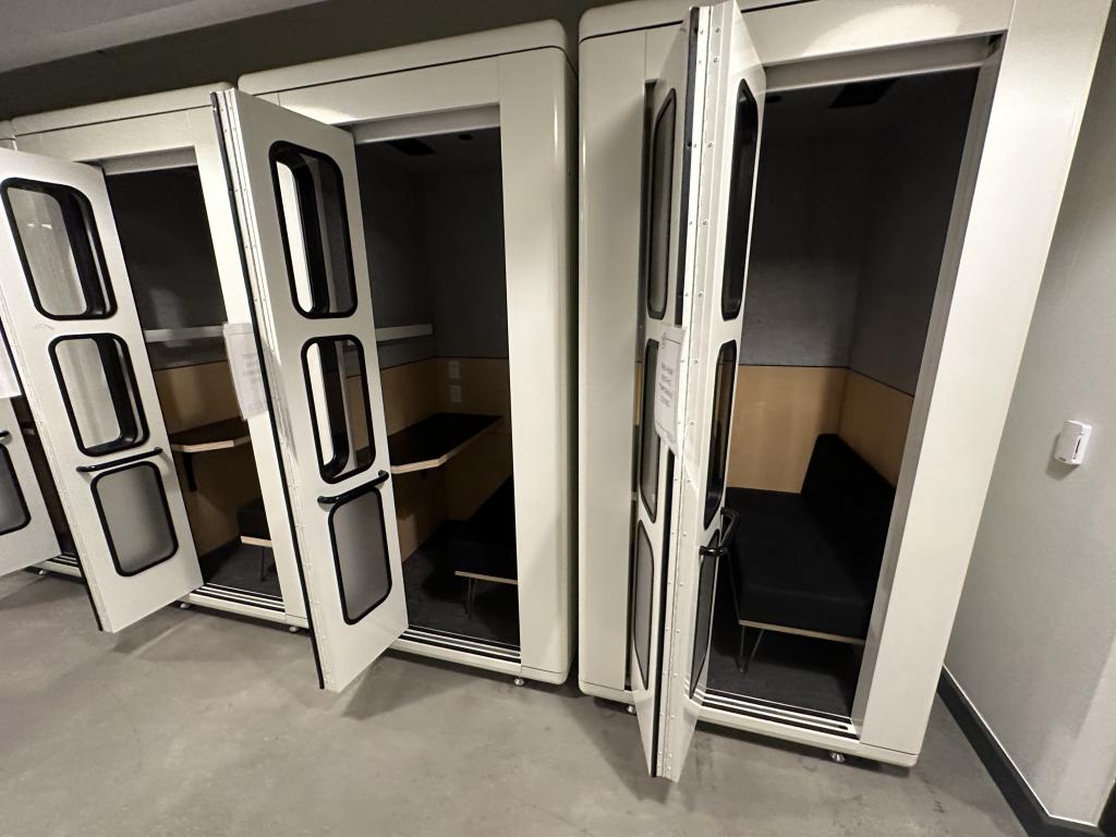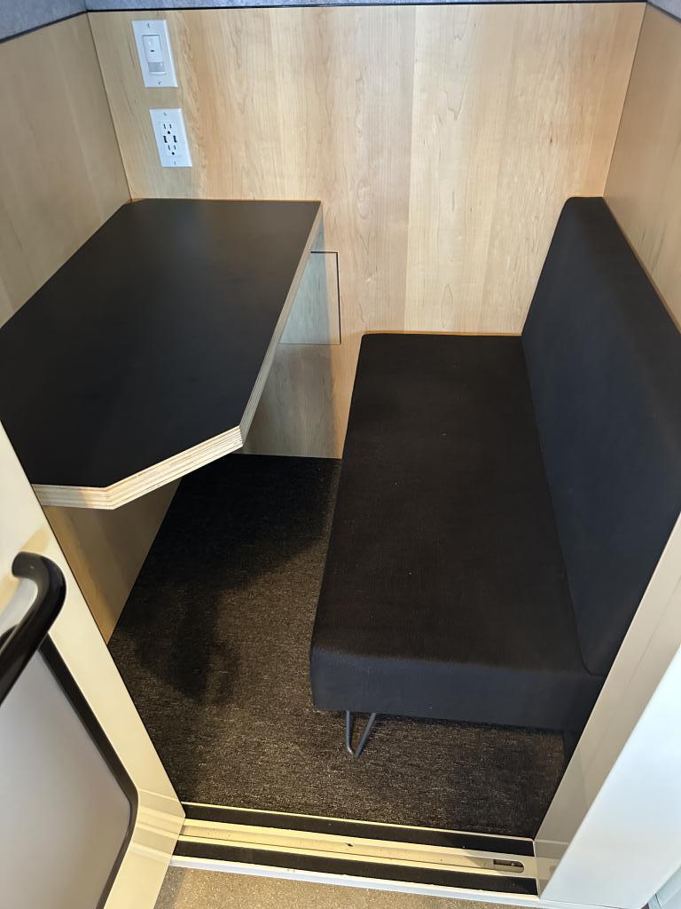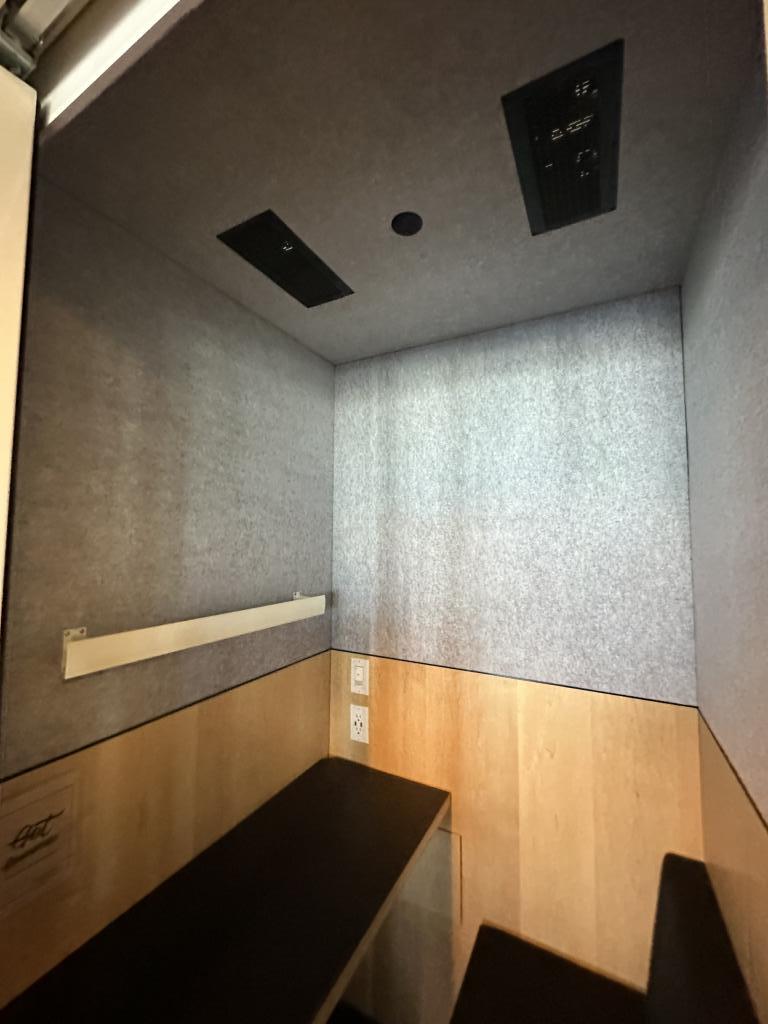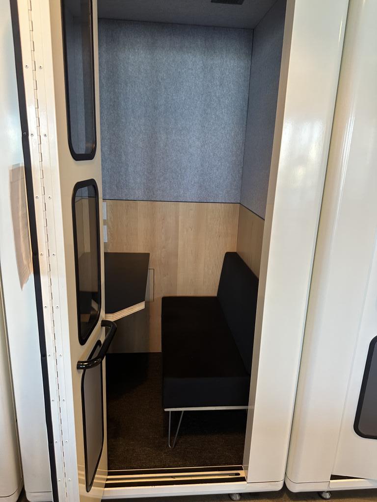 Description We have these white acoustical privacy and phone booths that are 47"x47"x92”T with glass doors and a metal frame. The inside has a bench seat and built in worksurface with light and 110V power duplex. This unit has circulating air that is powered by a fan with a full built in vent system.