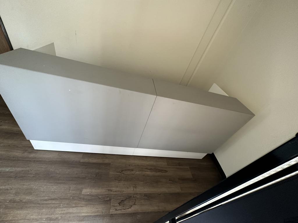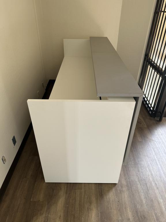 Description We have this white and grey modern lighted reception desk that is custom made from a refurbished Haworth desk. You can choose from any standard wilsonart laminate that is in stock.