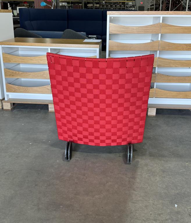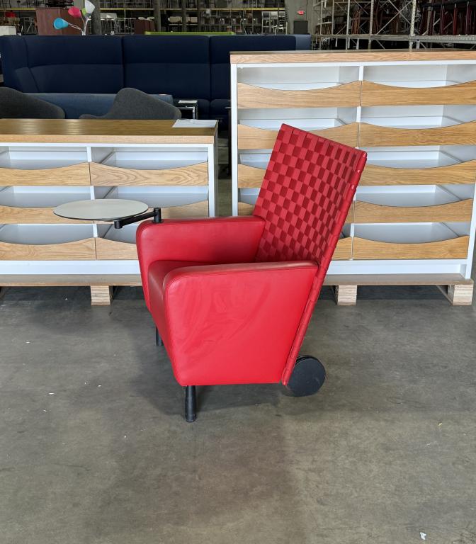 Description This lounge chair is vibrant and perfect for any lounge area. Boasting Davis Webb's iconic webbed back for unparalleled comfort, it's upholstered in durable leather, ideal for high-traffic areas. Complete with a pivoting tablet and two decent-sized wheels at the back for easy mobility, this chair combines style, comfort, and practicality for your space.*WHS_0524*