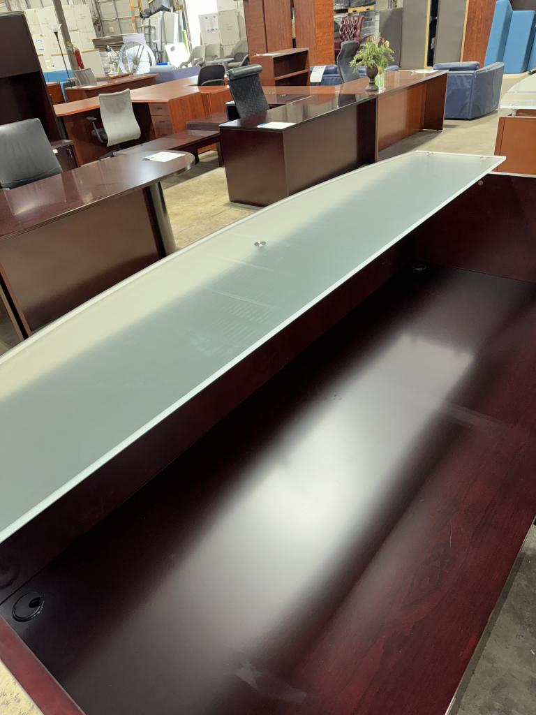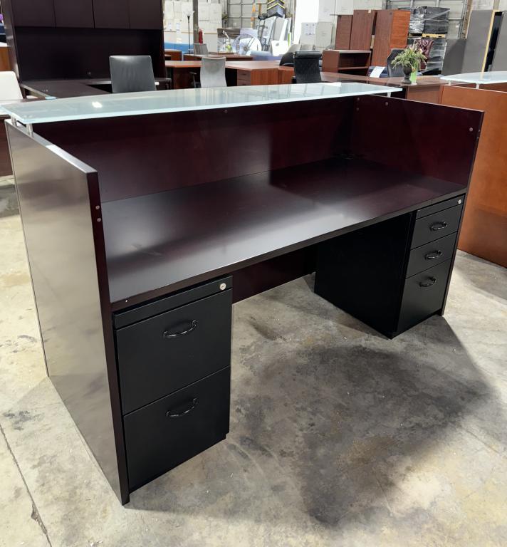 Description New in the box, the Cherryman receptionist desk features a stunning henna mahogany veneer with a frosted glass transaction top. Compact yet spacious, it offers ample storage, two grommets for cable management, and comes paired with a Steelcase file/file unit and a box/box/file pedestal for optimal organization. Perfect for smaller areas, this desk combines elegance and functionality.*WHS_0624*
