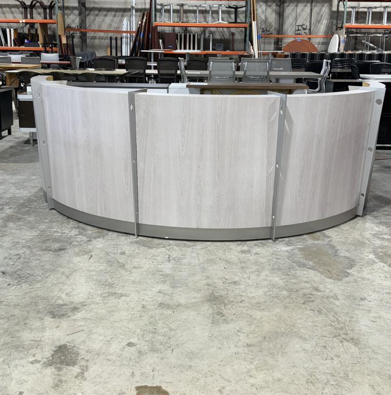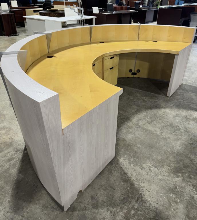 Description Striking curved receptionist desk, a blend of modern aesthetics and functionality. Crafted with a veneer maple finish interior and a sleek grey laminate exterior. Designed to accommodate two receptionists comfortably, it offers generous workspace. Equipped with two built-in box/file pedestals and four grommets for effortless cable management.Please note, the glass transaction top is not included, but this desk is being sold as is.*WHS_0624*