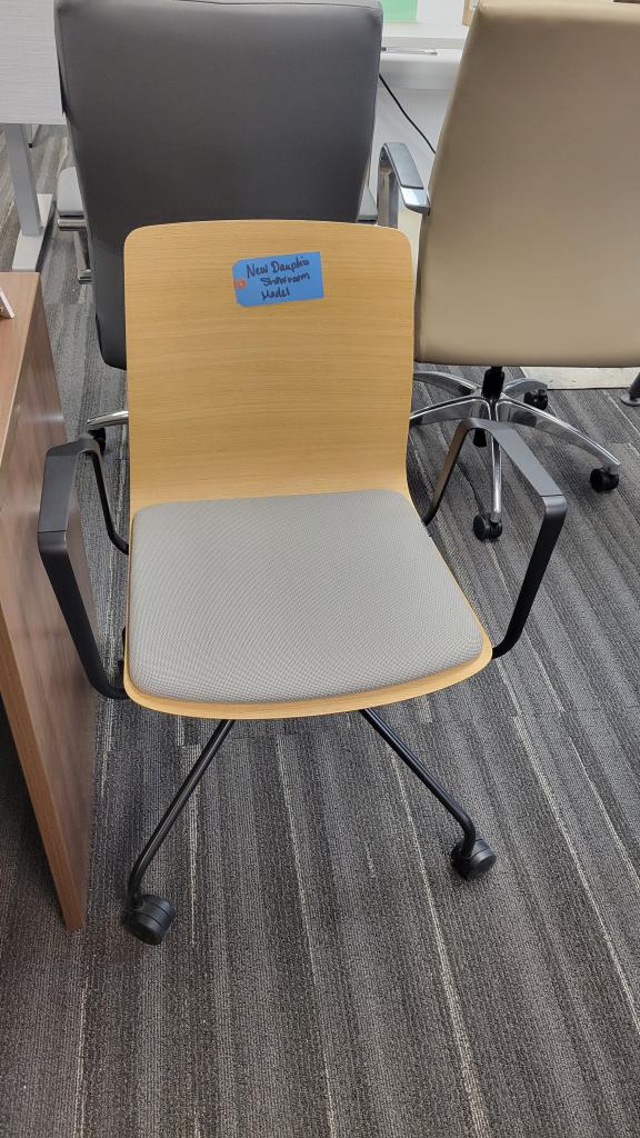 Dauphin Showroom Model Chair. Wooden with fabric seat. Rolling. Pristine.
