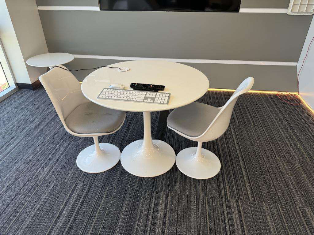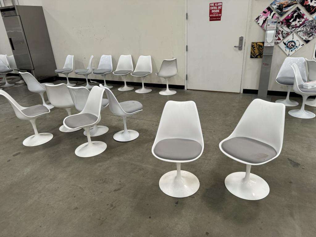 We have these white tulip Coalesse styled guest chair that had a study base and comfortable seat.