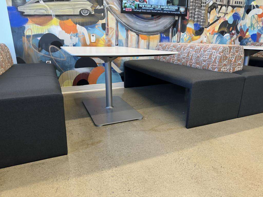 We have these Steelcase banquet seating that are 72" wide mid back two-tone pieces that go great by themselves or back-to-back. Tables available as well ask for pricing.