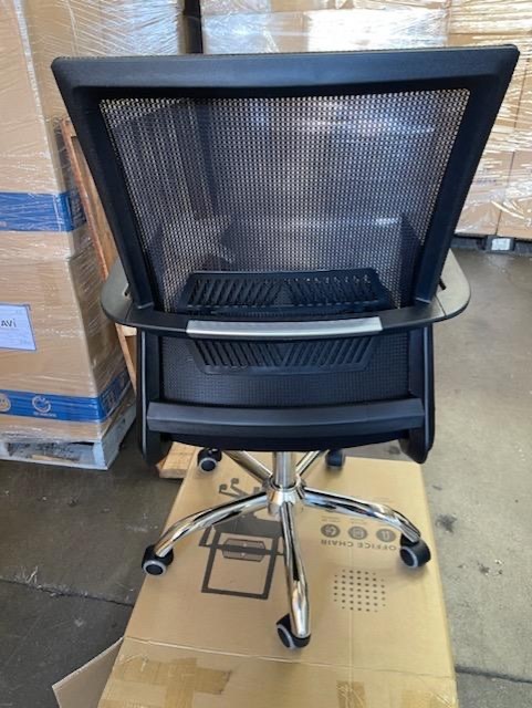 Description We have 150 brand new in the box with black mesh back and fabric seat chairs with a chrome base. These are meant to be ergonomic office chairs at a budget price and we sell them for $99 each brand new in quantities