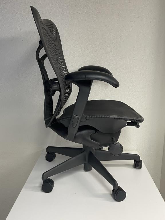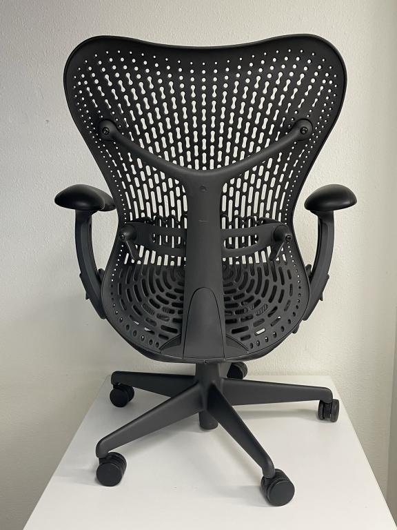 Description We have the Herman Miller Mirra Available in stock ergonomic chair. This chairs has a black seat and grey graphite frame.