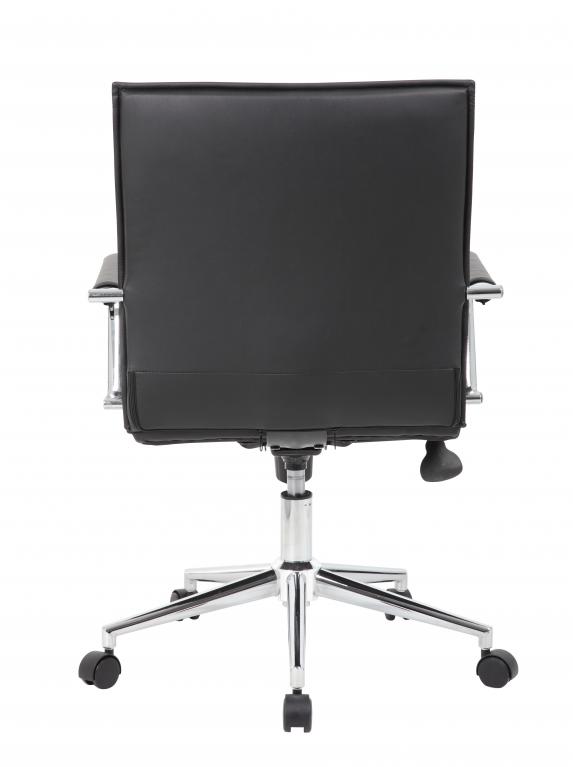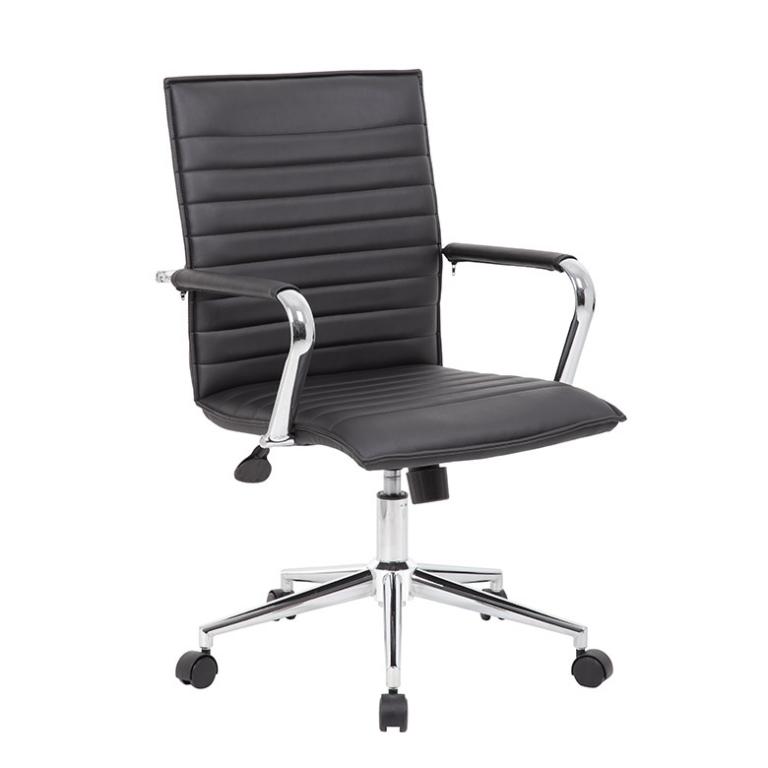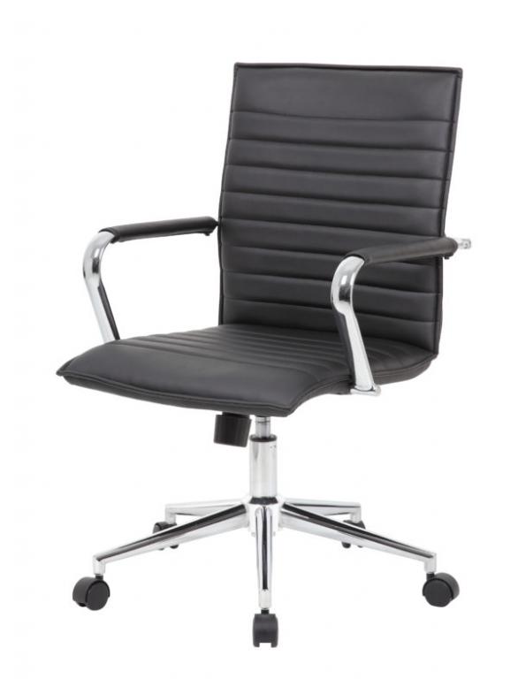 Description The Eames Inspired task chair in black vinyl is designed with fixed chrome arms for that pop of metallic color that brings any room or office to the next level. The chair also features a gorgeous and strong chrome 25 inch base with 2 inch nylon dual wheel castors.
