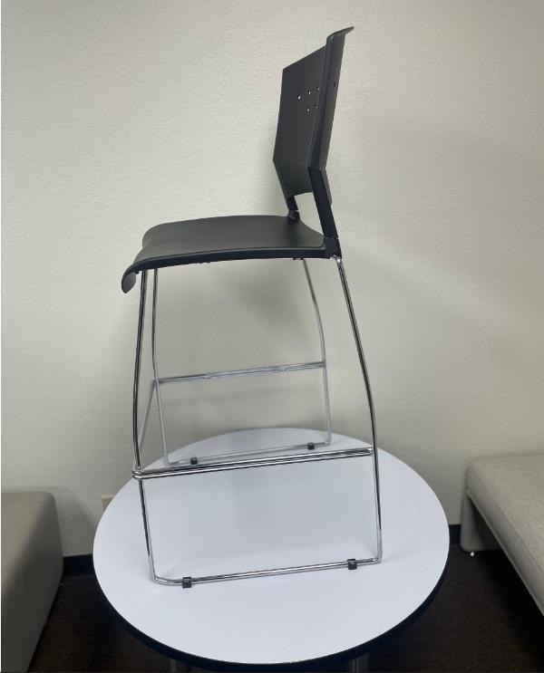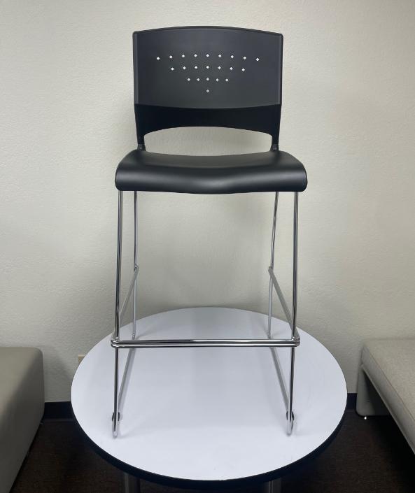 Economical bar height stool with a stylish outlook. The seat and back are made of black polypropylene, which gives the stool superior durability and lumbar support. The stool has a solid chrome frame and the sculpted seat back has an opening integrated into it for enhanced ease with mobility. These stools can be stacked, up to five high, for space-saving and storage.