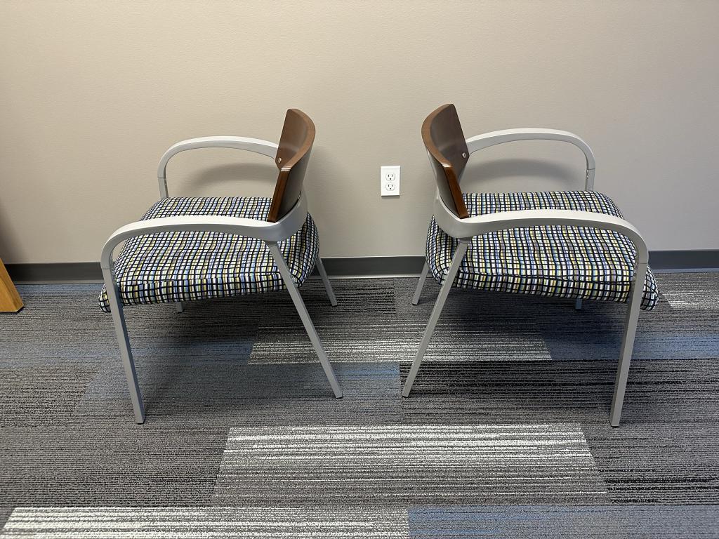 Description We have these National Aurora Veneer & Fabric Blue guest chairs that are in excellent condition. These are meant to be sold in pairs for guest seating or for private offices. This is also a great chair for a waiting area. These chairs do stack as well for space saving.