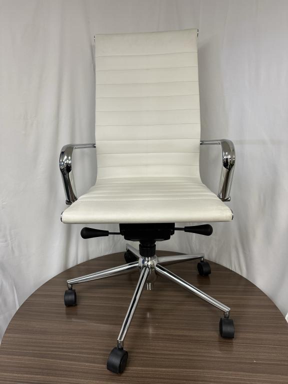 We have these white DMI ribbed high back Eames styled chairs that have a tilt lock and pneumatic cylinder. These are perfect for any occasion. These are also great conference room or dining room chairs..