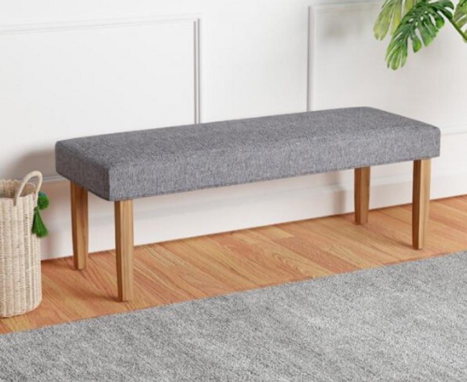 This is a quality tailored commercial grade linen bench with elegant wood legs. It has a padded seat, upholstered in slate gray linen. Driftwood finished wood legs. Rectangular shape. Good for use in many areas such as reception area, home entry way, kitchen/dining bench, or end of bed.