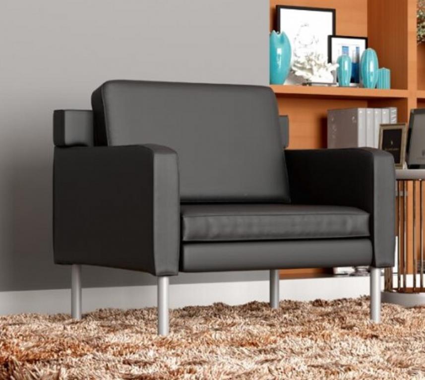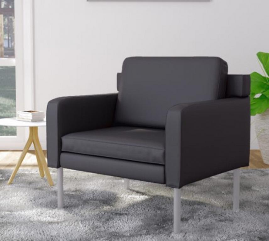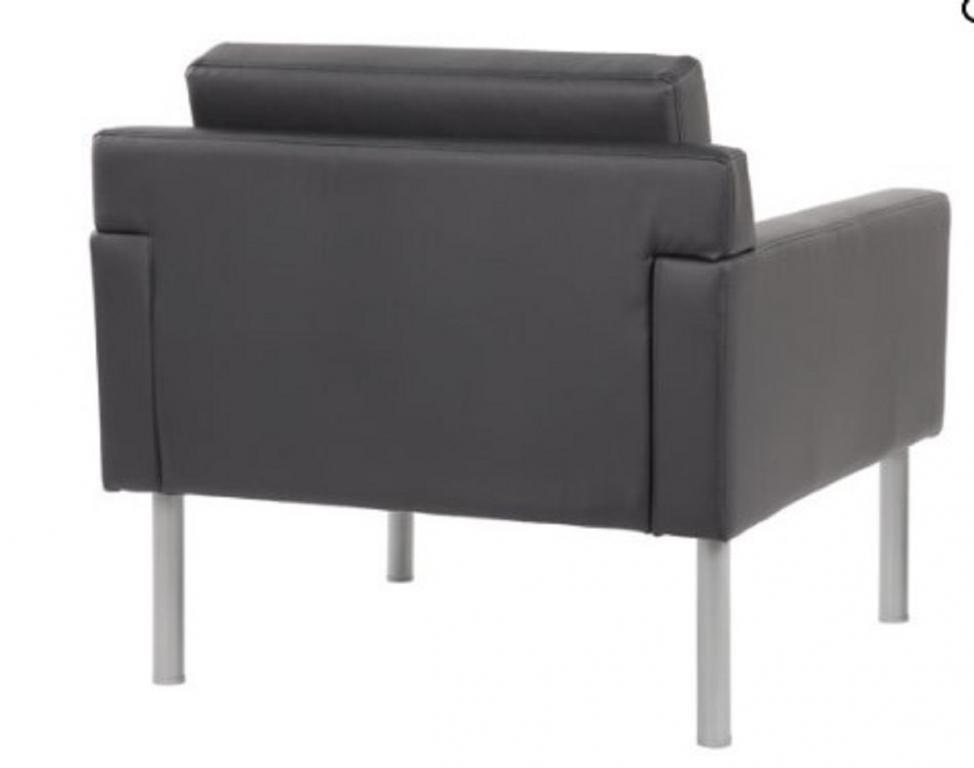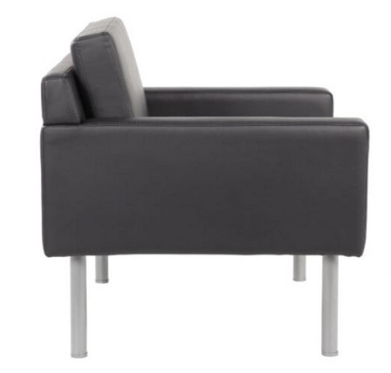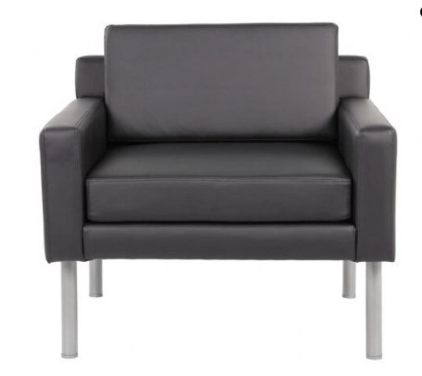 This upholstered lounge chair will look great in any room. It is upholstered in a soft touch antimicrobial vinyl. Designed with clean lines and fixed box arms. It has a deep, thick cushion that allows you to sink in and relax and it has sleek black steel legs with plastic levelers at the bottom for stability.