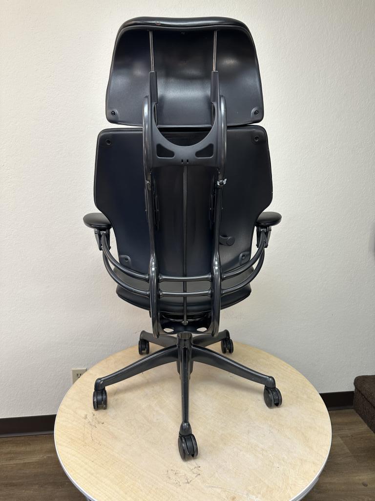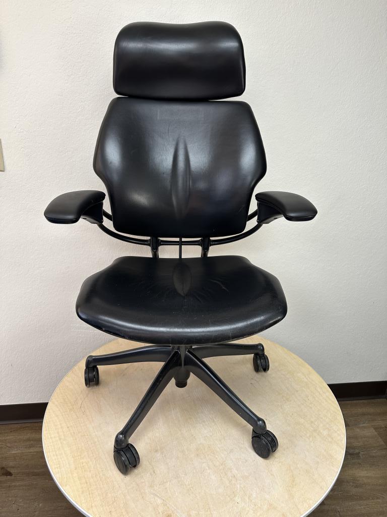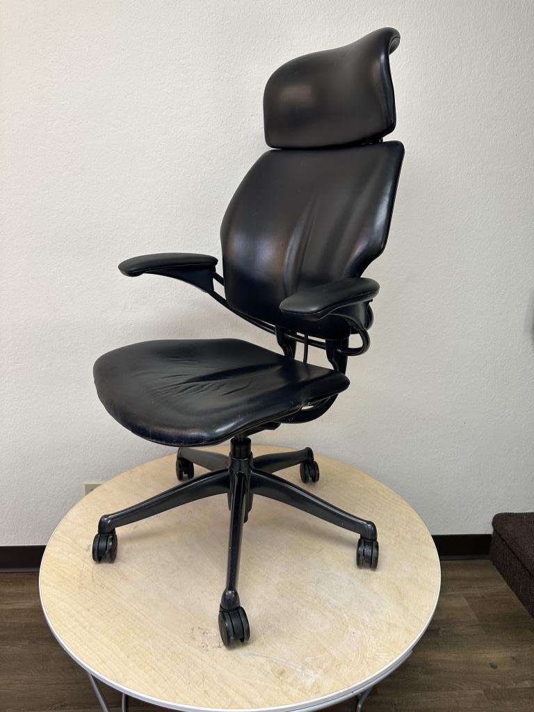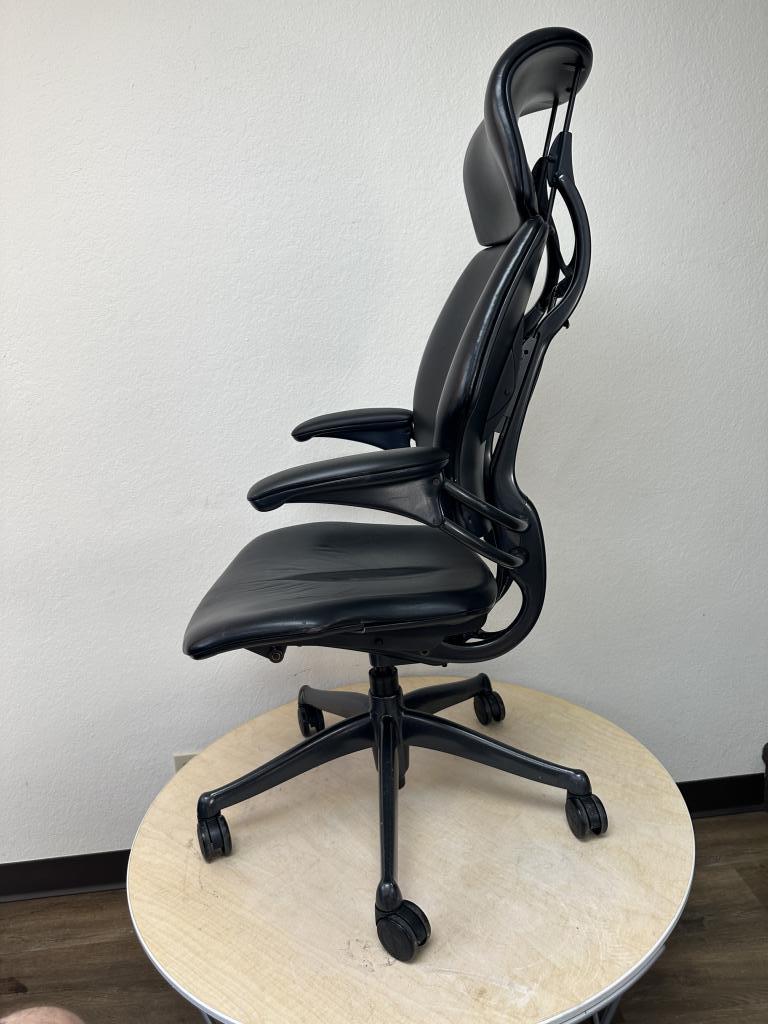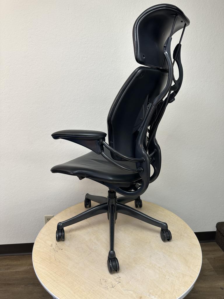 We have these Humanscale freedom fully loaded black leather with head rest, adjustable arms and pneumatic cylinder.