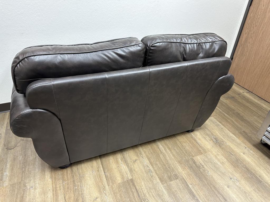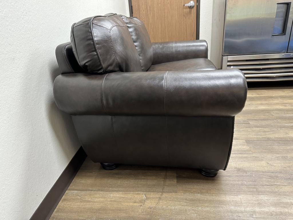 We have this Addyson Living traditional leather love seat that is approximately 63”. This love seat also has a pair of matching club chairs.