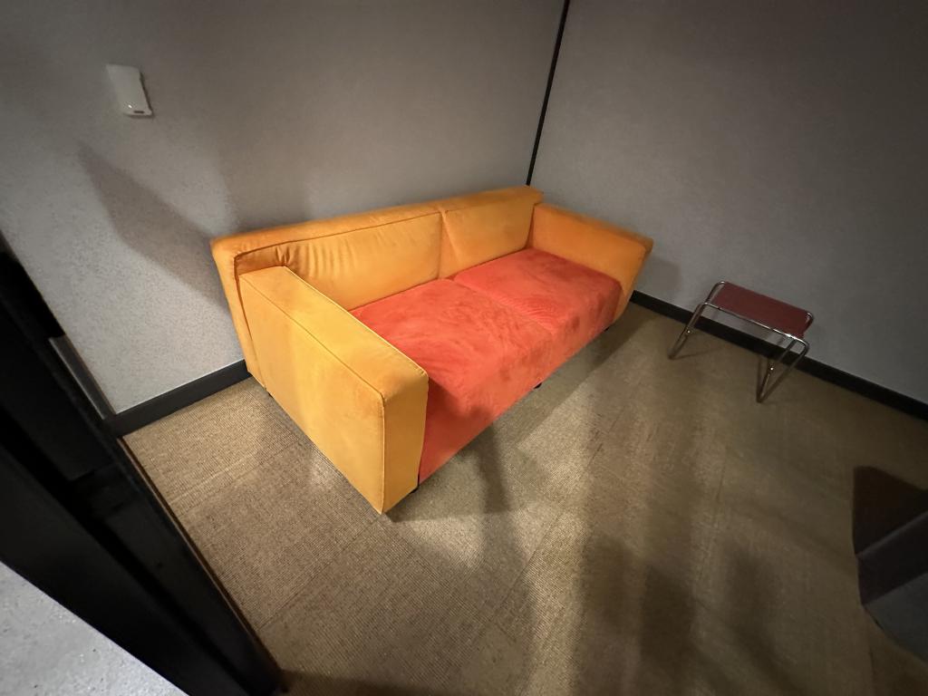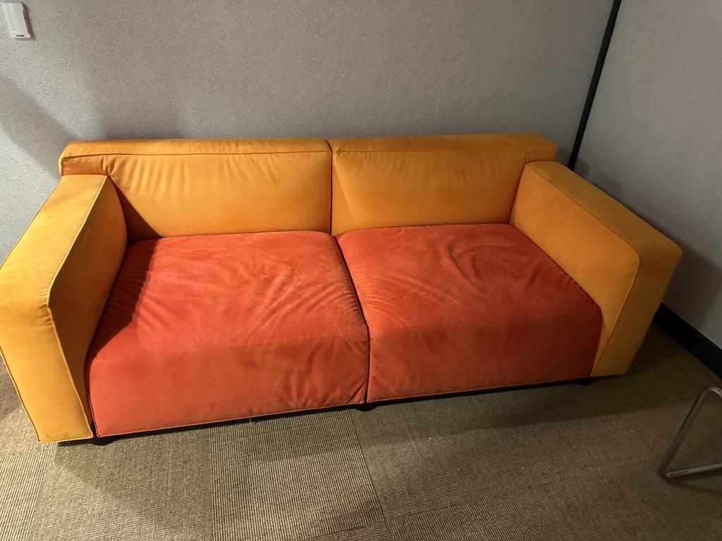We have this Orange and Red Suede Commercial Sofa that came from We Work and was hardly ever used in excellent condition.