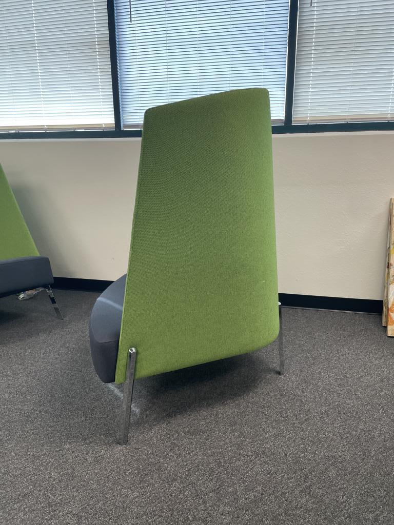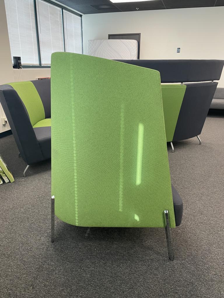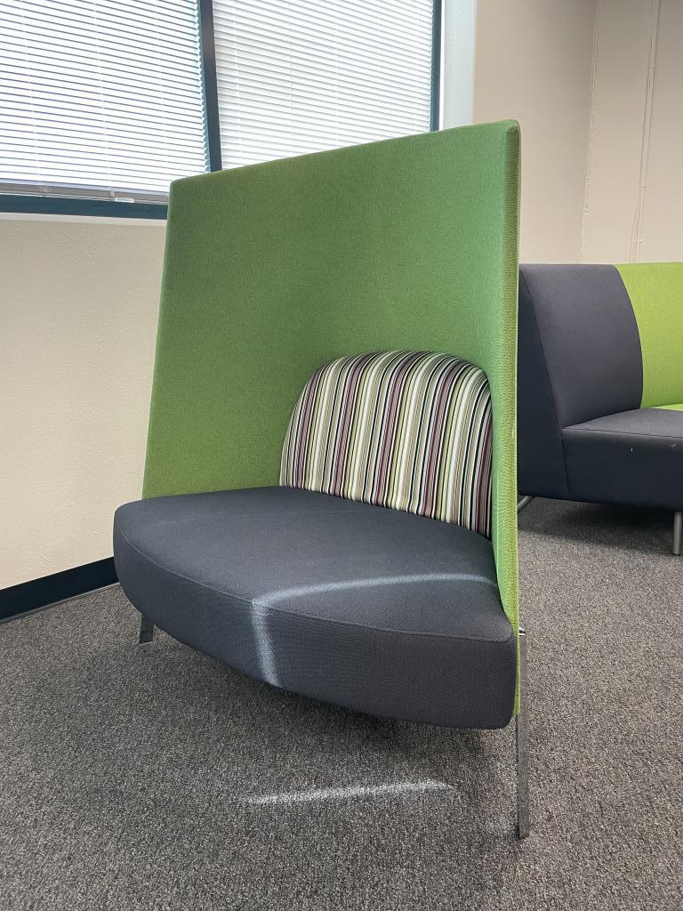 We have these high back green and graphite Teknion lounge sofas. They have a curved back and lumbar support pillow attached. They are perfect for any lounge space or collaborative area.