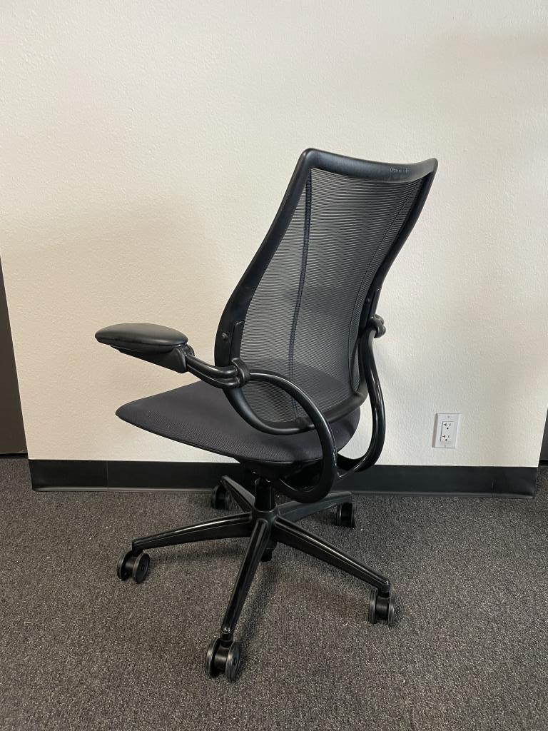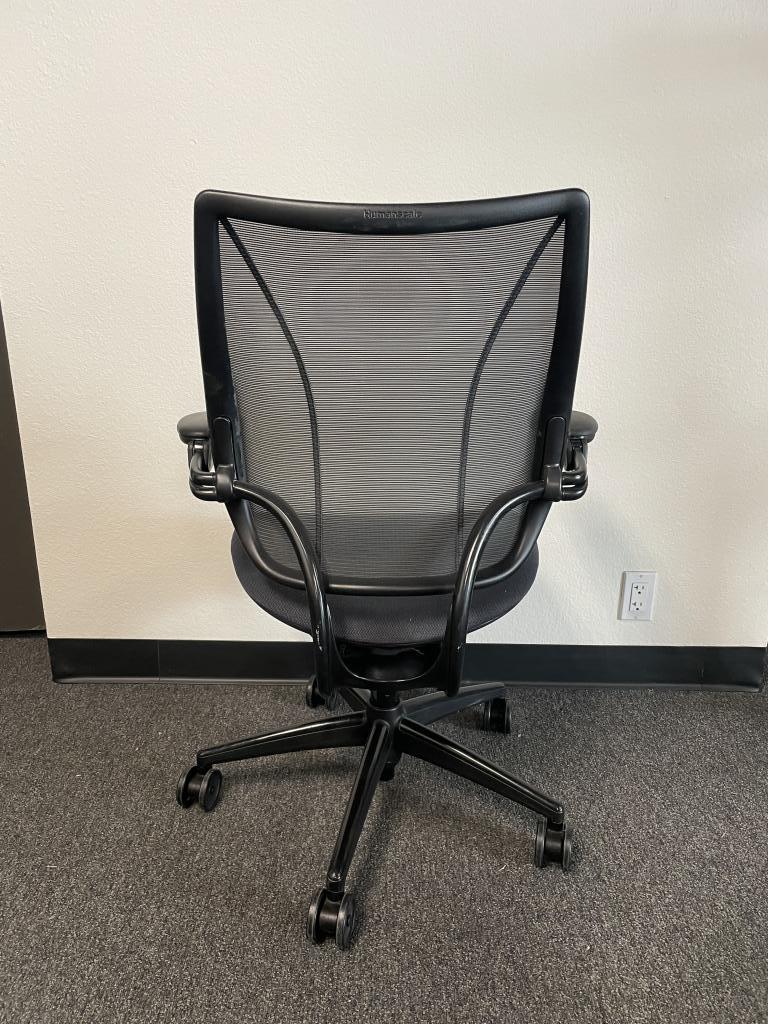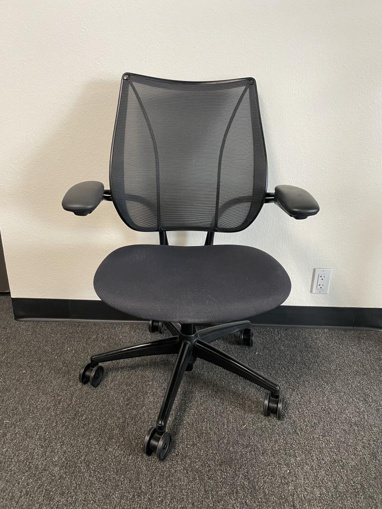 We have this black seat and mesh back Humanscale Liberty ergonomic task chair with adjustable arms and pneumatic cylinder.