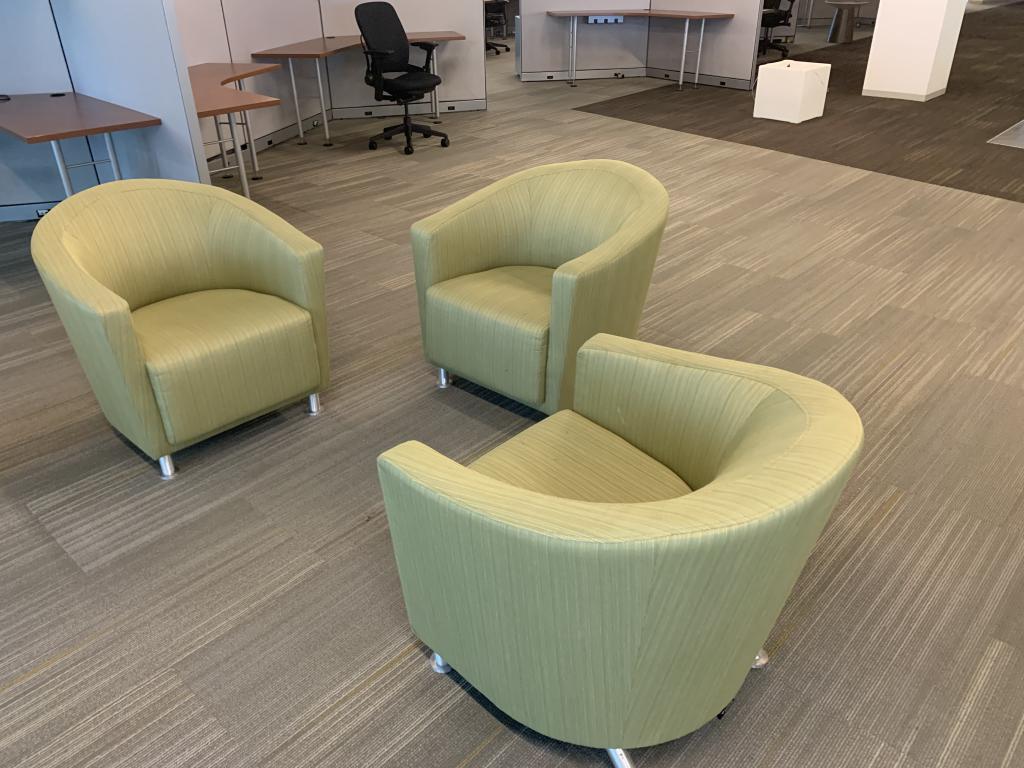 We have these Steelcase Coalesee green Jenny chairs in green fabric available in great condition.