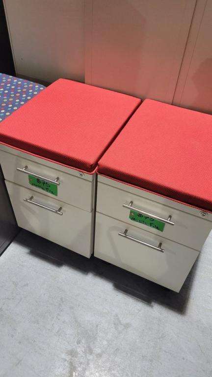 Mobile File Cabinets with Red Fabric Tops. One box and one vertical file drawer. Eye-catching design.