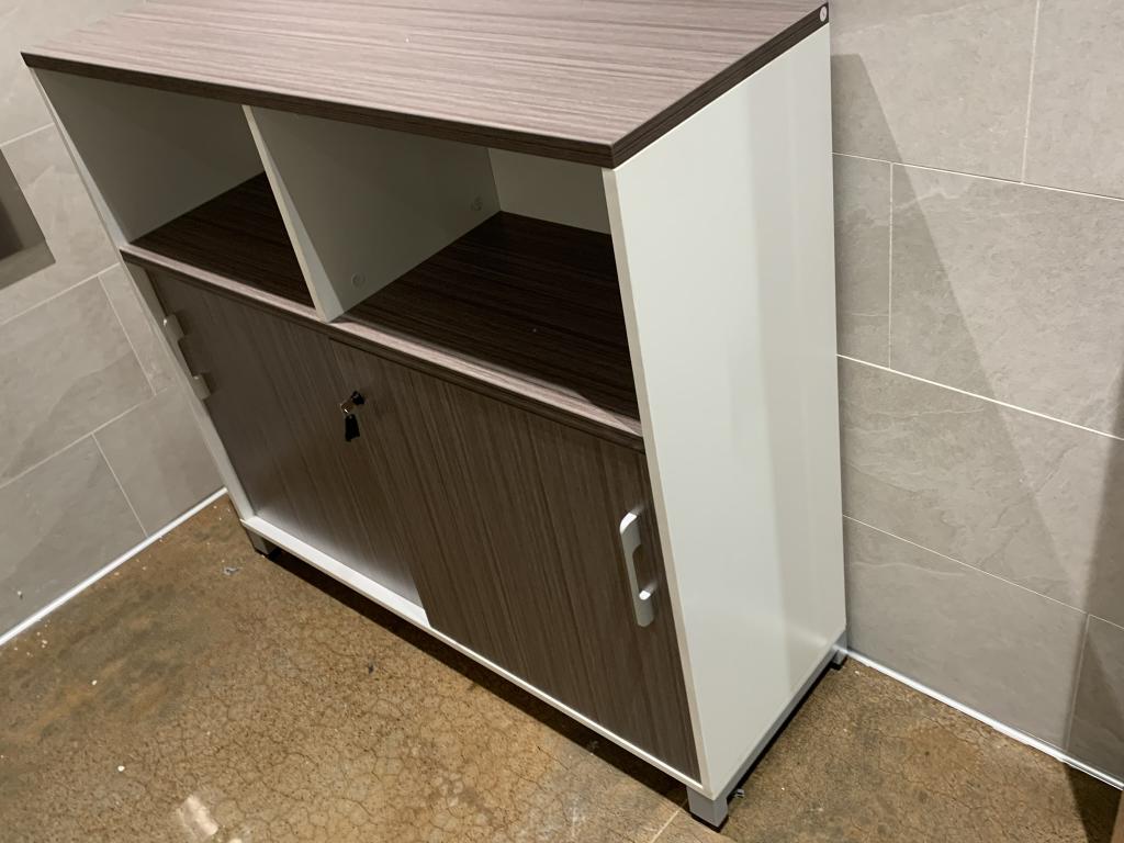 We have this Boss modern storage cabinet that is driftwood and white with two shelves and a sliding storage tower. Dimensions: 48"x18"Dx43"H