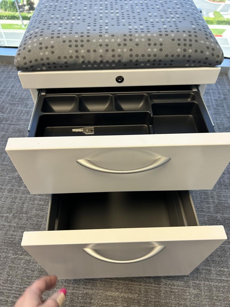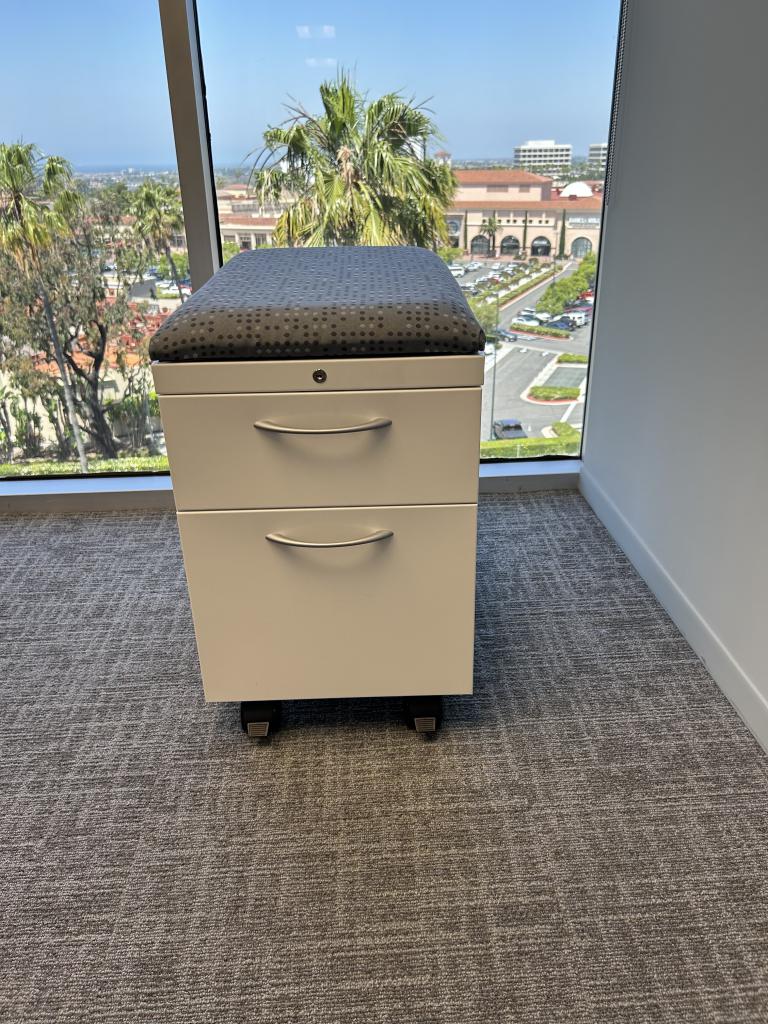 We have these Mobile Allsteel grey cushion top pedestals. Perfect for any storage solution or for an extra seat.