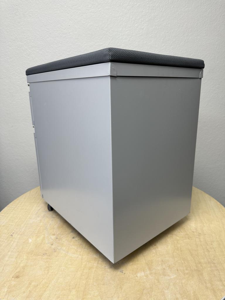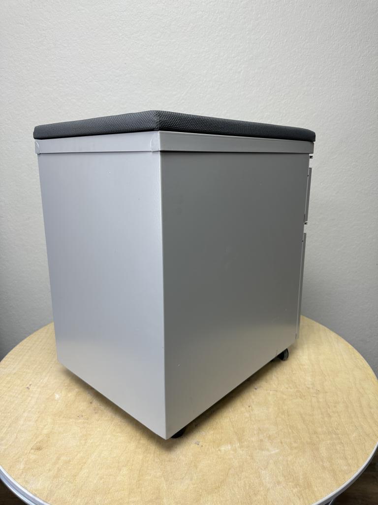 We have these Herman Miller mobile pedestal file cabinets with grey cushion. They are 19”x15”Wx22.5”T they are a space silver with a box file combination and a handle for easy move ergonomics.