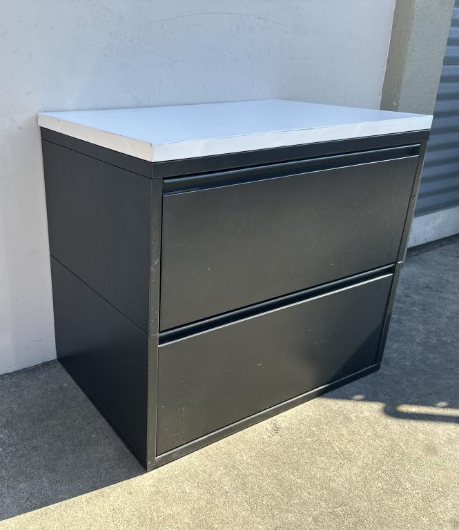 We have these Herman Miller 30” black lateral files with metal top. In the photo attached we custom fit a white work surface to show that a top can be put on the lateral file for aesthetics or to create a credenza: