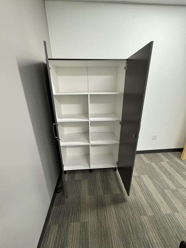 We have this 3’ wide x 6’ tall OFS grey and white storage cabinet in excellent condition.