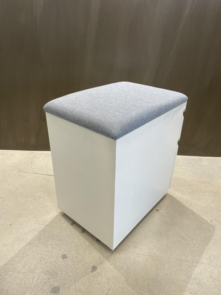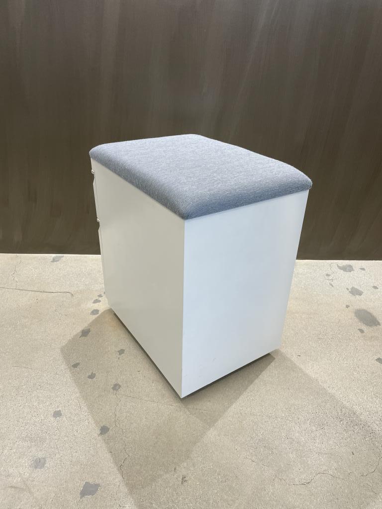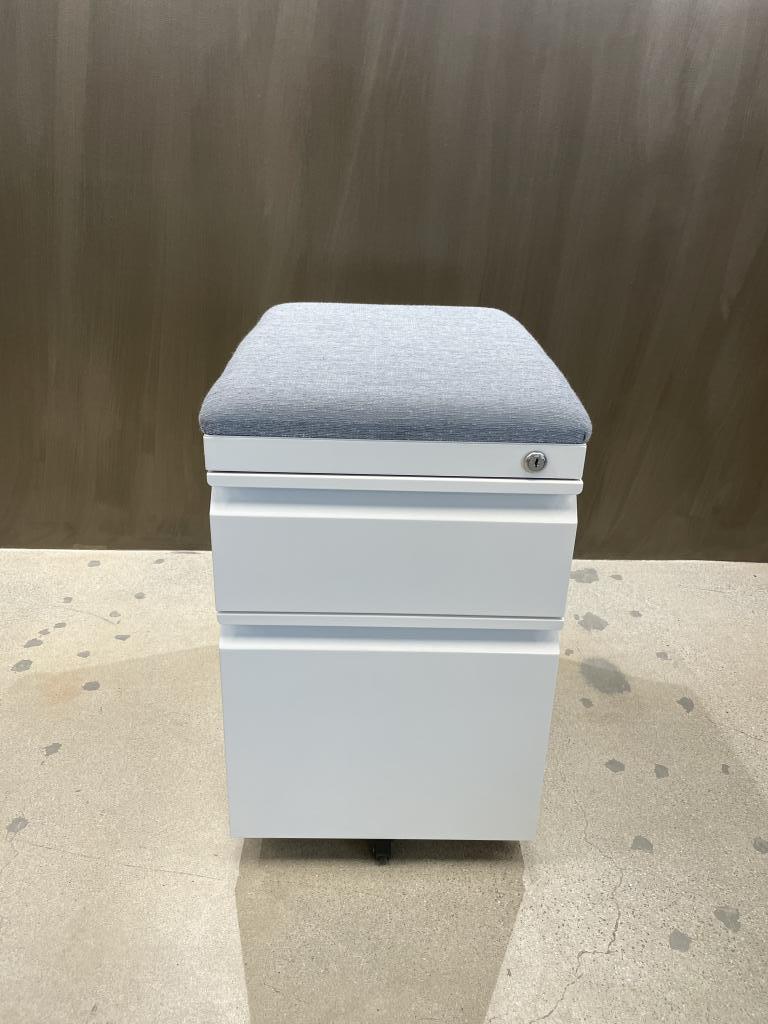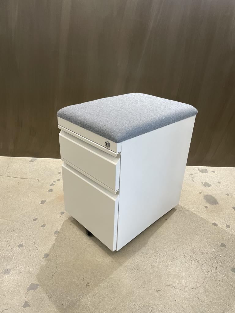 We have these Herman Miller white mobile pedestals with grey cushions. They are in excellent condition and have original keys. They have a Box and File combination.