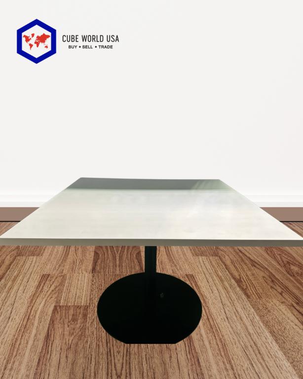 Description We have these National 42"x42" white top surface with commercial grade black steel base. This table comfortably can sit 4 people around it with enough space to work or eat. This table is perfect for collaboration, executive offices, breakrooms and as well as homes.