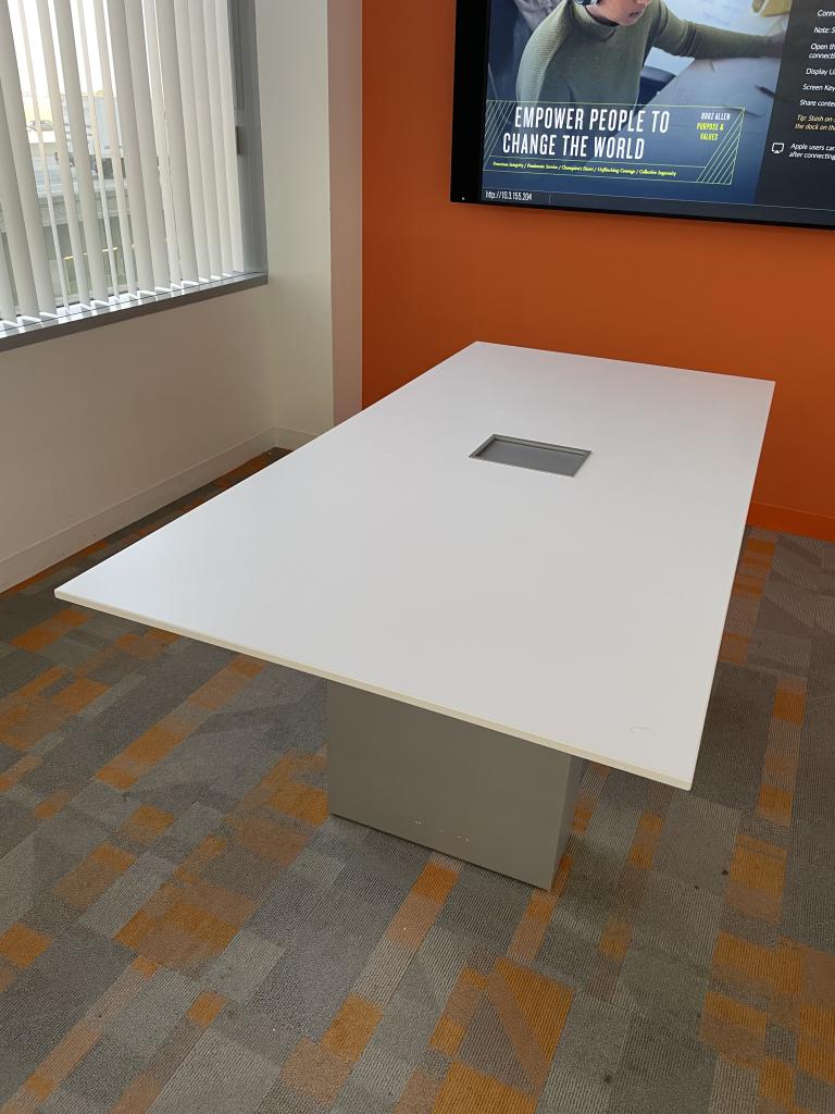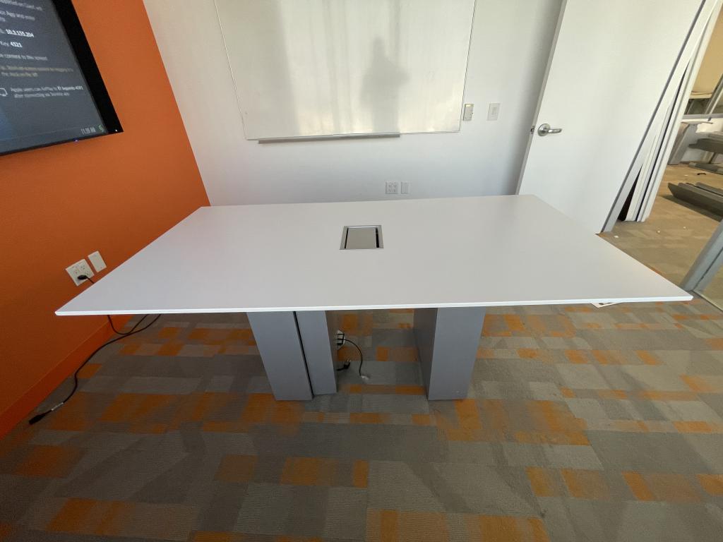 Description We have these Steelcase Payback 6'x3' powered conference table with data and power management built into the legs. The top has an up mounted power module for direct plug in. The top surface is arctic white and the base is iridium silver. We can also make the tops silver and base white as well or a solid custom color.