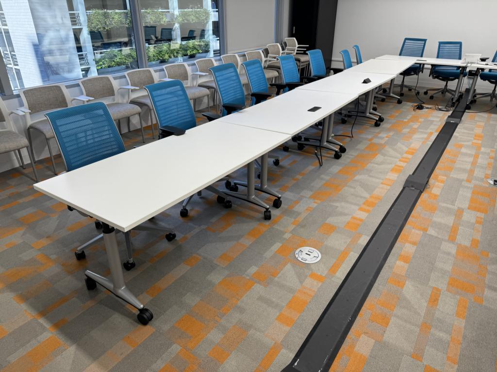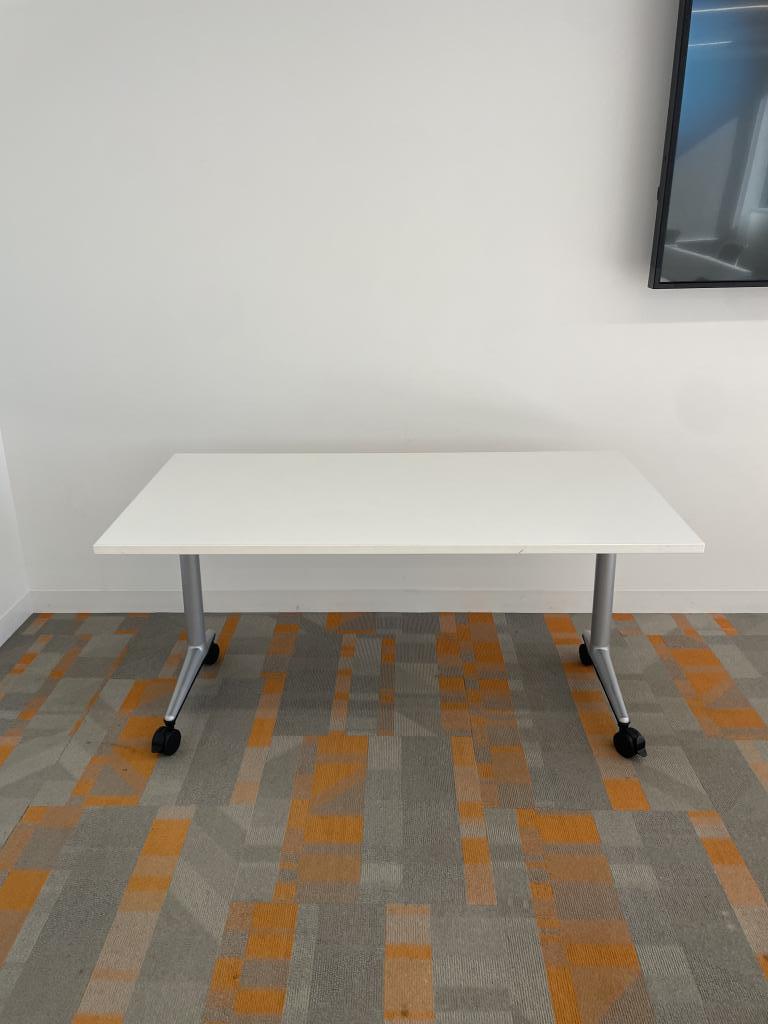 We have these Steelcase Coalesse nesting tables with white surface and silver legs on casters. 5 of these tables have power built in and 5 do not. Surfaces without power $275 each nesting table Surfaces with power $349 each nesting table
