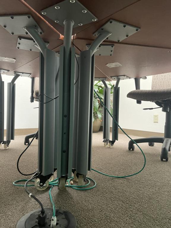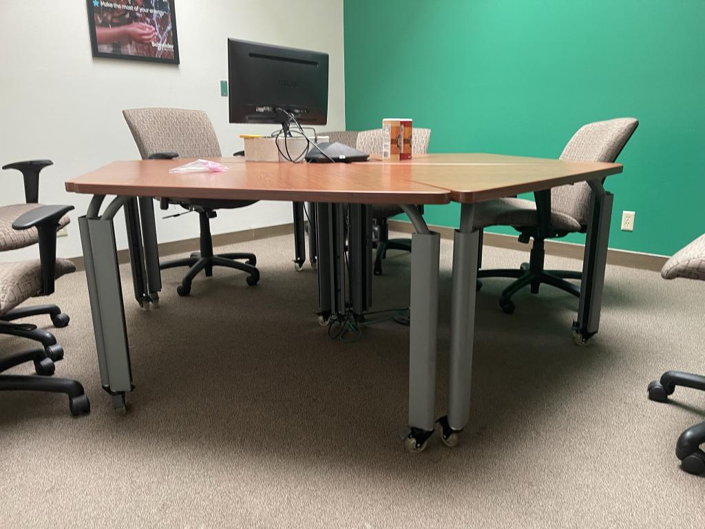 This is a modular Teknion conference table. Each piece comes out to be a 42"x42"x42" triangle and when put together makes a 7' wide conference table. The conference table is on casters for easy mobility and makes up a hexagon design.