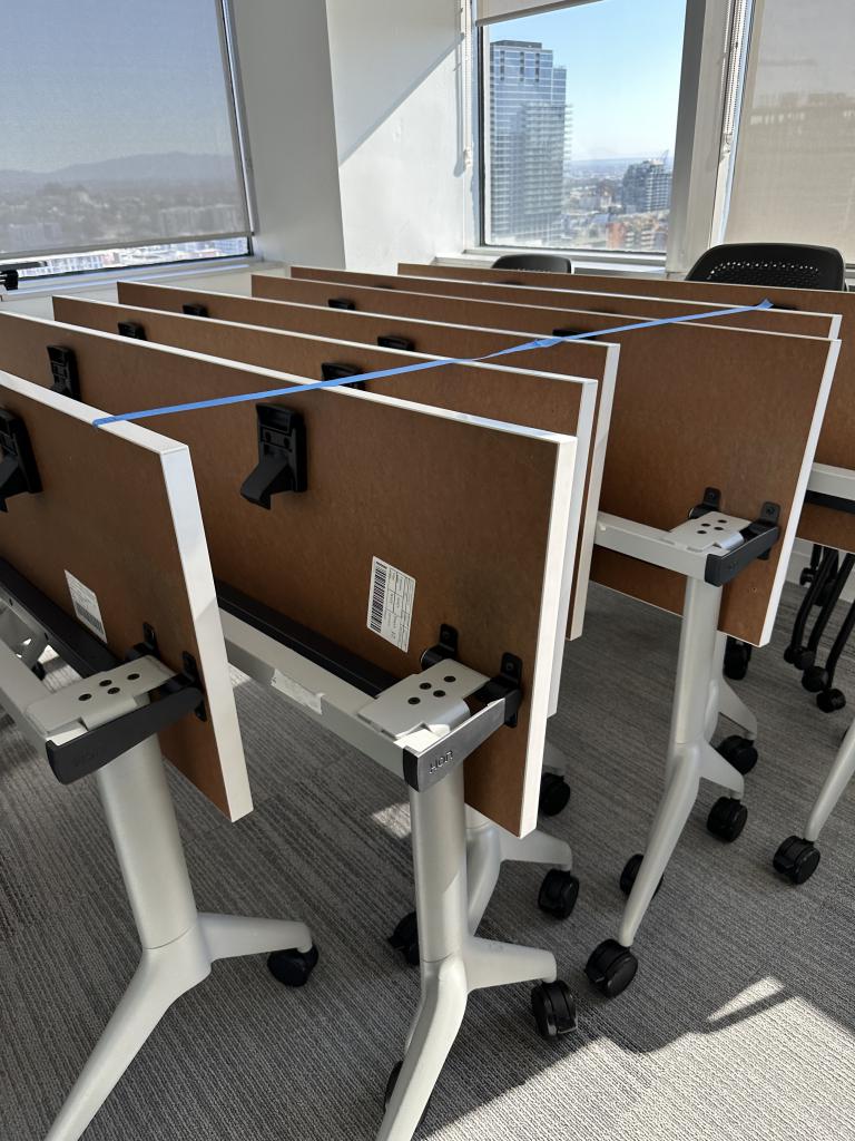 We have these nesting tables made by Hon. The surfaces that they come with are 60"x18" in a white top with silver base. We can also switch out the surfaces for new or pre owned surfaces in stock.