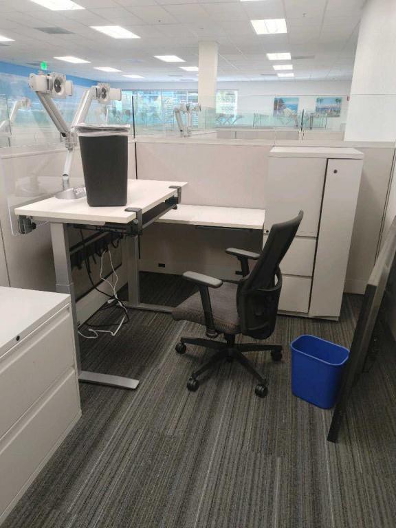 Each height adjustable table comes with dual monitor arms, wire management troth and keyboard tray.