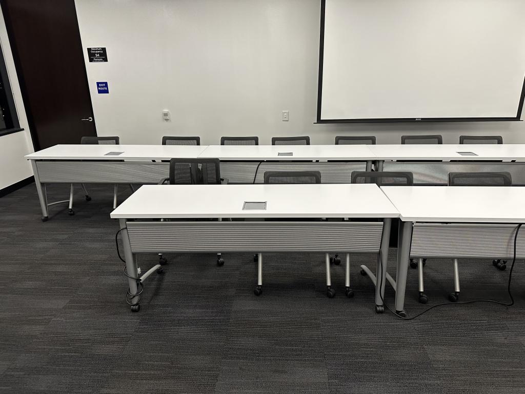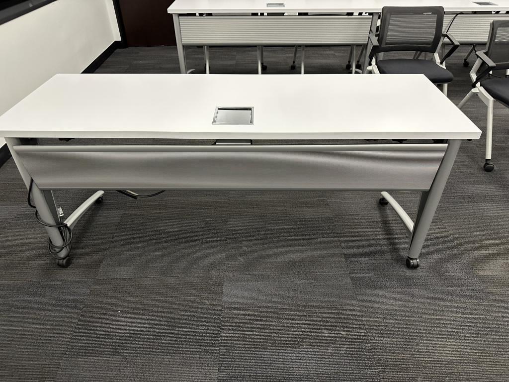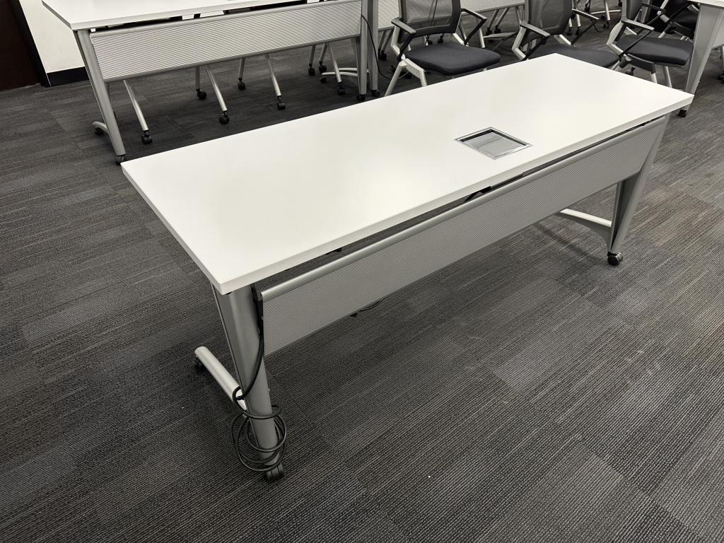 We have these Nucraft Powered White Mobile Nesting Tables that are 6’x2’ with casters. These desks come with a steel modesty panel