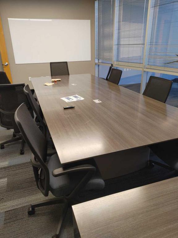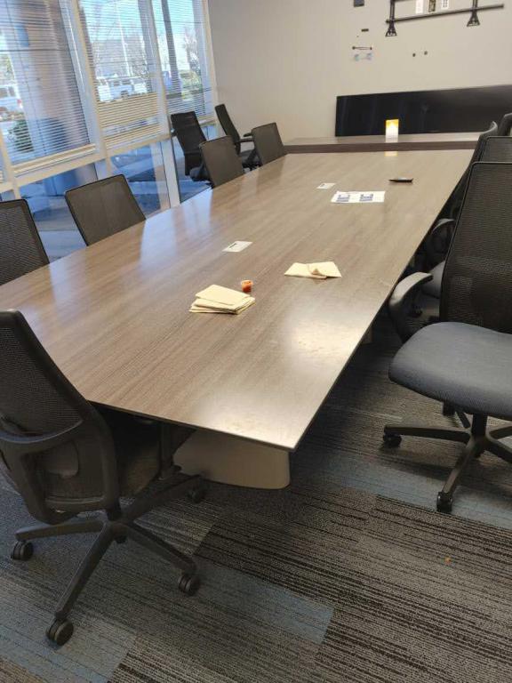 We have this 12 foot slate grey to with modern champaign bronze base by Berco Designer powered conference table that is sleek and modern. It has power down the center and a triple hollow base that is perfect for data and wire management.