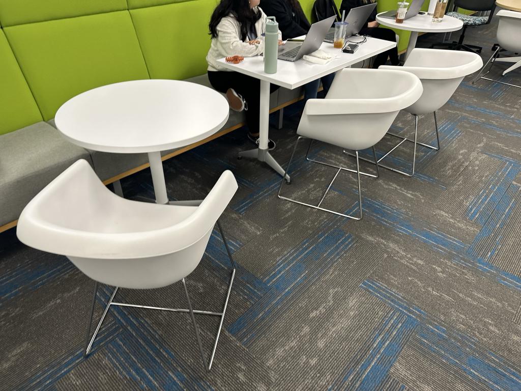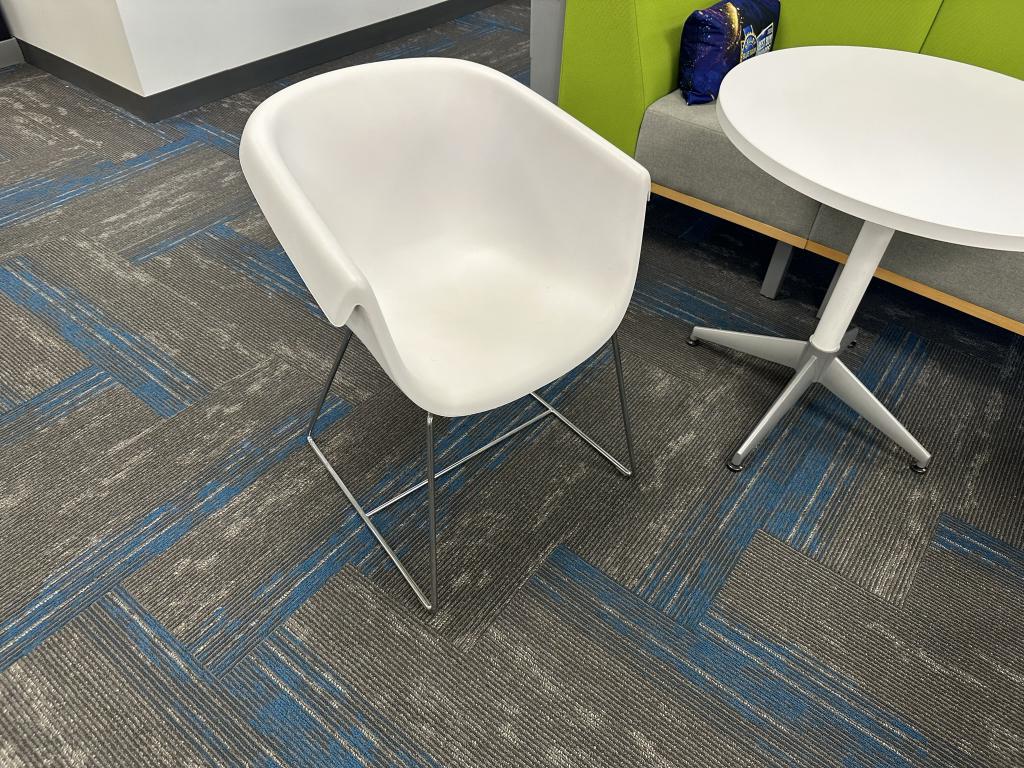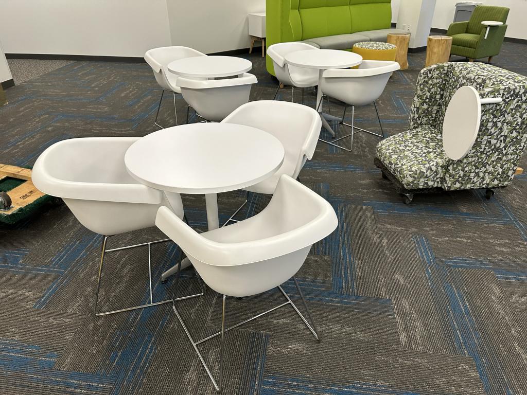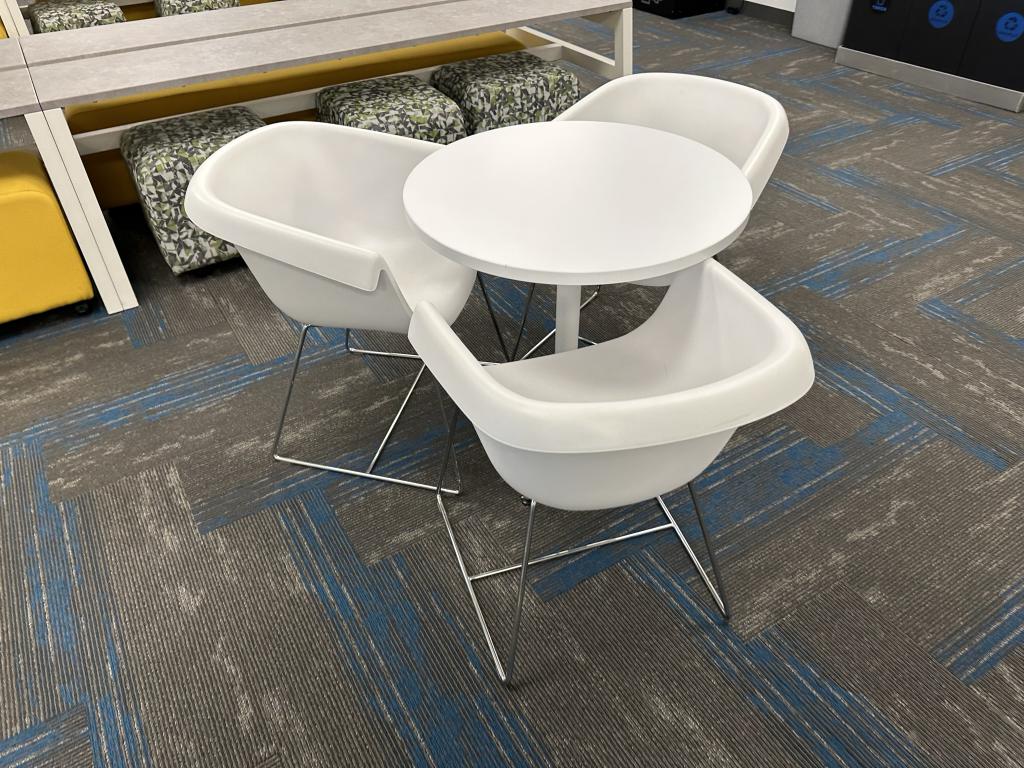 We have these 30" white round tables made by OFS with steel legs in excellent condition.