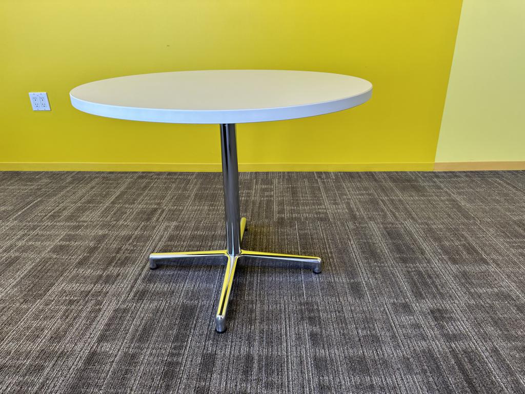 We have these Coalesse chrome T base 3 foot white round tables that are in excellent condition. These are the nicest round commercial tables on the market and are the premiere line by Steelcase called "Coalesse"