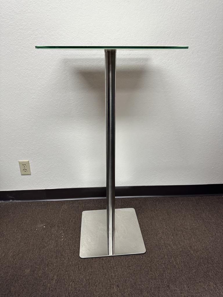 We have these two bar height 2’x2’ table with frosted glass and a chrome base.