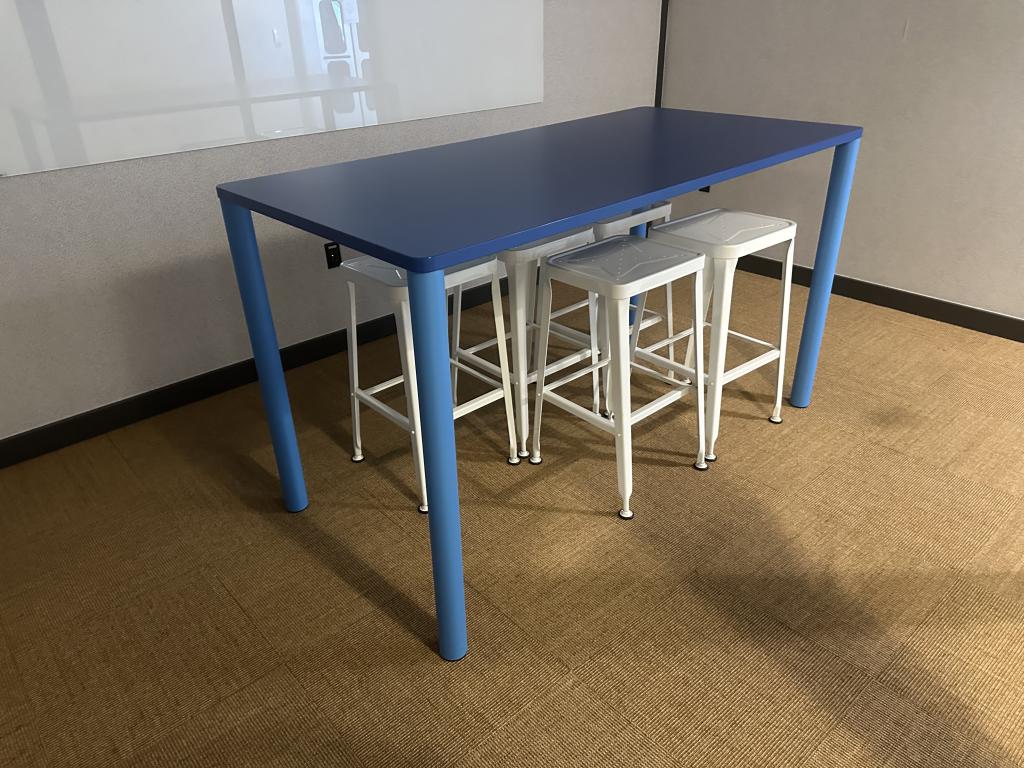 We have this 8' Poppin bar height blue conference table. Perfect blend of style and functionality for productive and visually appealing gatherings.