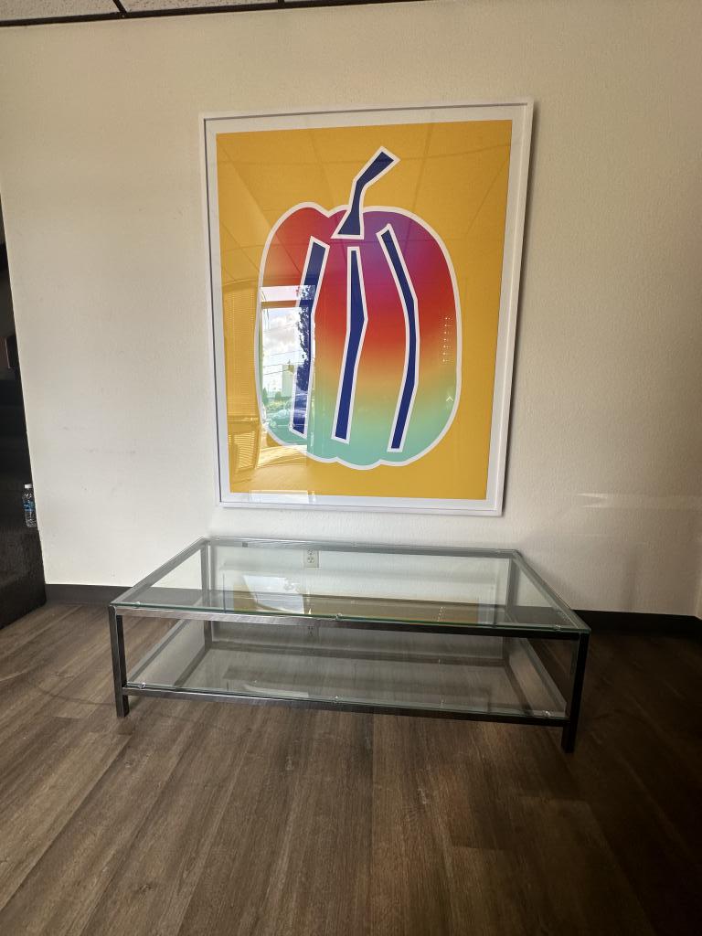 We have this double glass occasional table that came from Warner Brothers. The dimensions are 54”x23”x15”tall