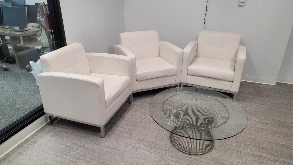 We have this modern glass top 3ft wired steel base table in excellent condition. This is a perfect center coffee table or accent side table for any office or home.